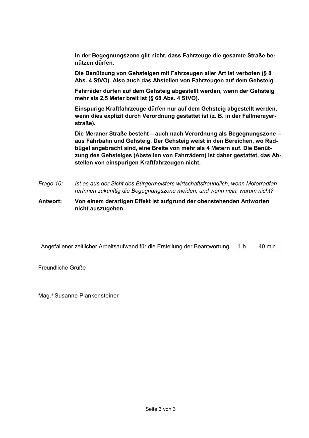 Ist es aus der Sicht des Bürgermeisters wirtschaftsfreundlich, wenn MotorradfahrerInnen zukünftig die Begegnungszone meiden, und wenn nein, warum nicht?