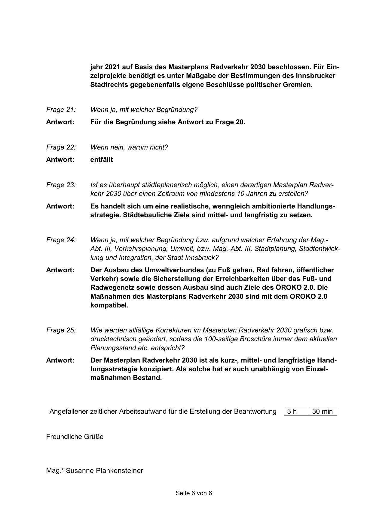 jahr 2021 auf Basis des Masterplans Radverkehr 2030 beschlossen. Für Einzelprojekte benötigt es unter Maßgabe der Bestimmungen des Innsbrucker