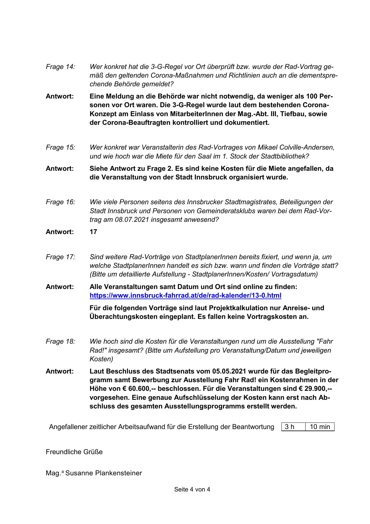 Angefallener zeitlicher Arbeitsaufwand für die Erstellung der Beantwortung