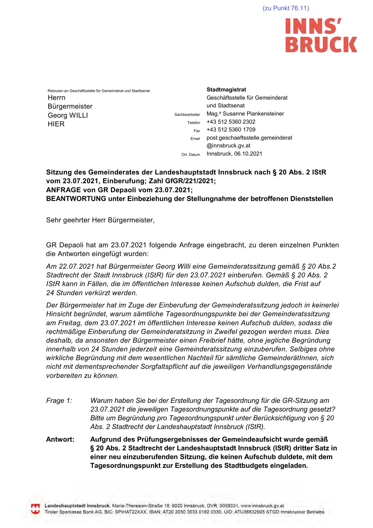 Am 22.07.2021 hat Bürgermeister Georg Willi eine Gemeinderatssitzung gemäß § 20 Abs.2