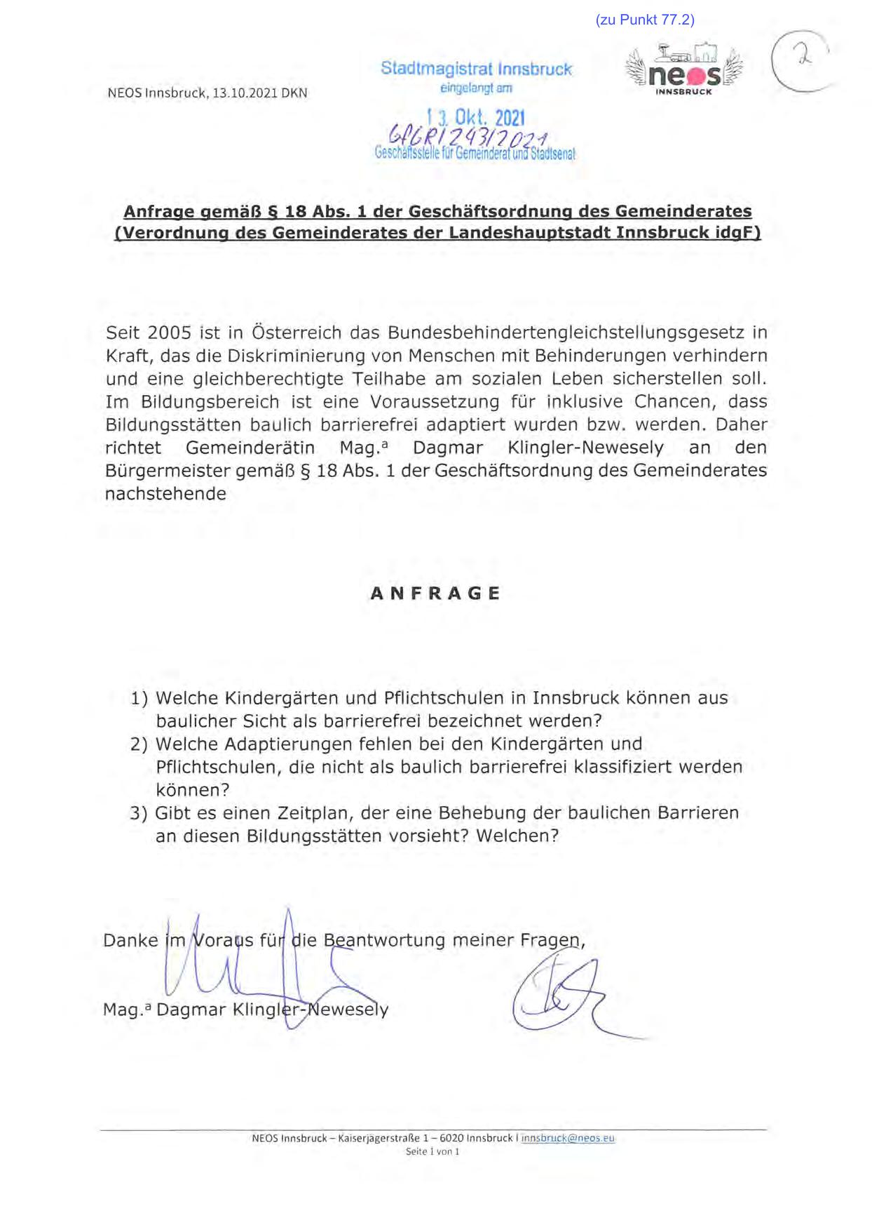 1) Welche Kindergärten und Pflichtschulen in Innsbruck können aus