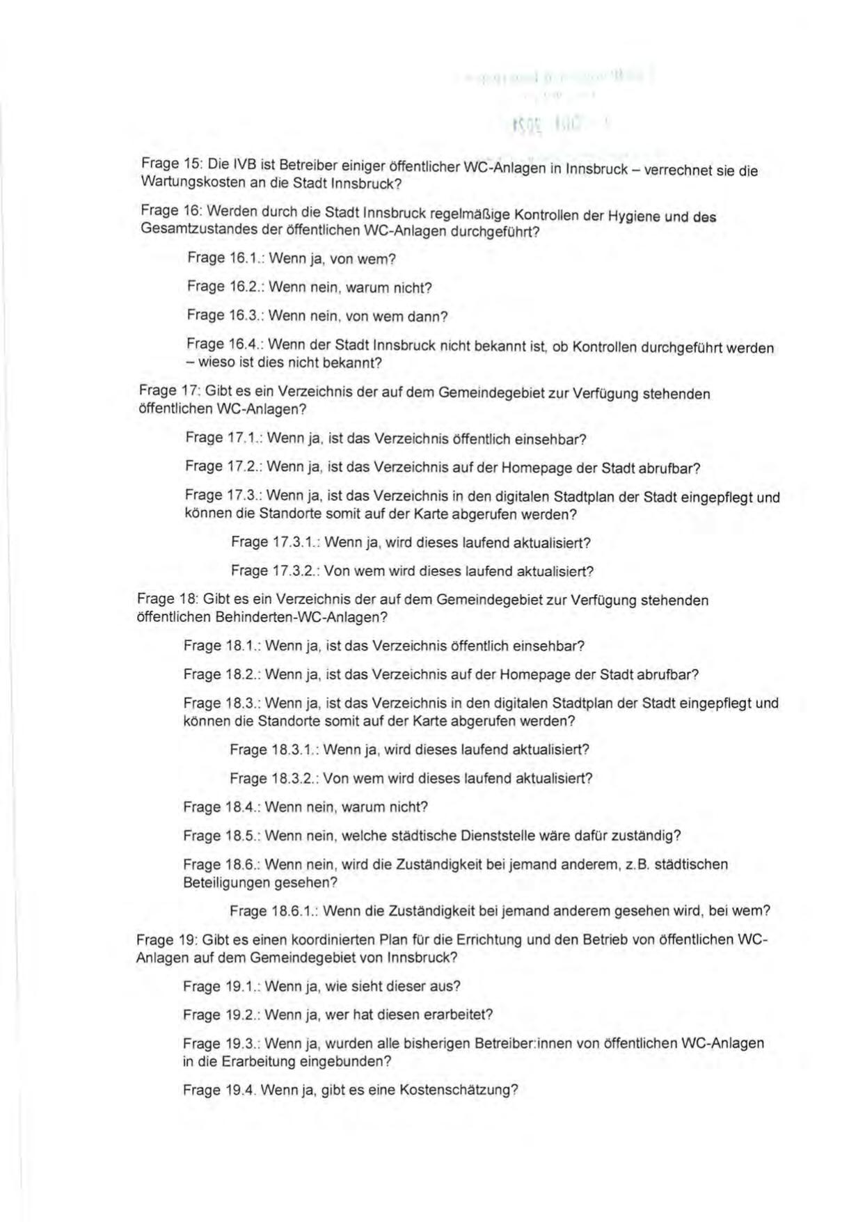 Frage 19: Gibt es einen koordinierten Plan für die Errichtung und den Betrieb von öffentlichen WCAnlagen auf dem Gemeindegebiet von Innsbruck?