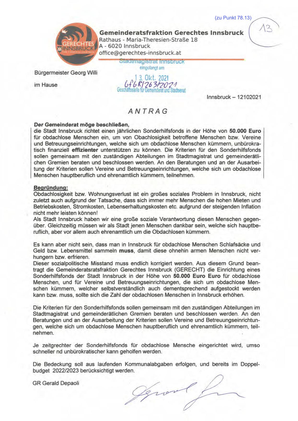 Dieser sozialpolitische Misstand muss endlich korrigiert werden. Aus diesem Grund beantragt die Gemeinderatsratsfraktion Gerechtes Innsbruck (GERECHT) die Einrichtung eines