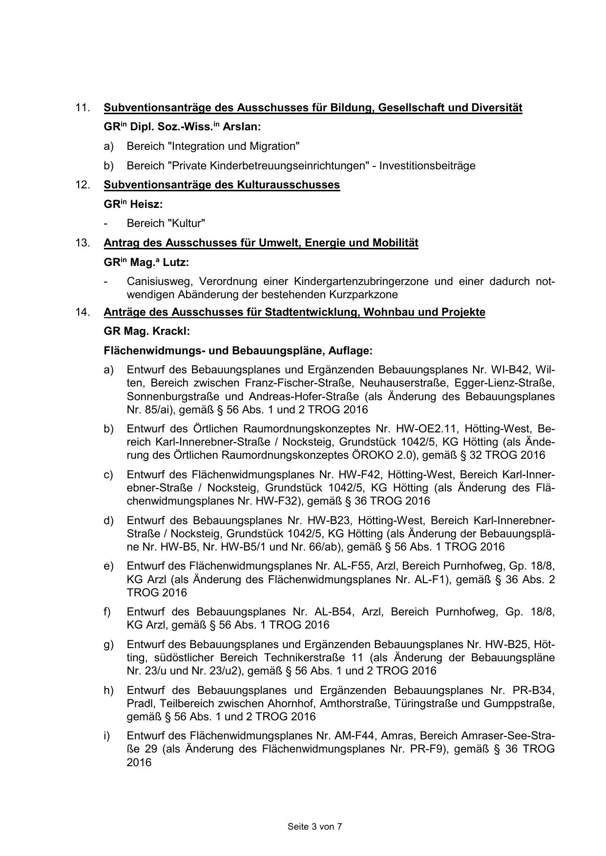 Anträge des Ausschusses für Stadtentwicklung, Wohnbau und Projekte