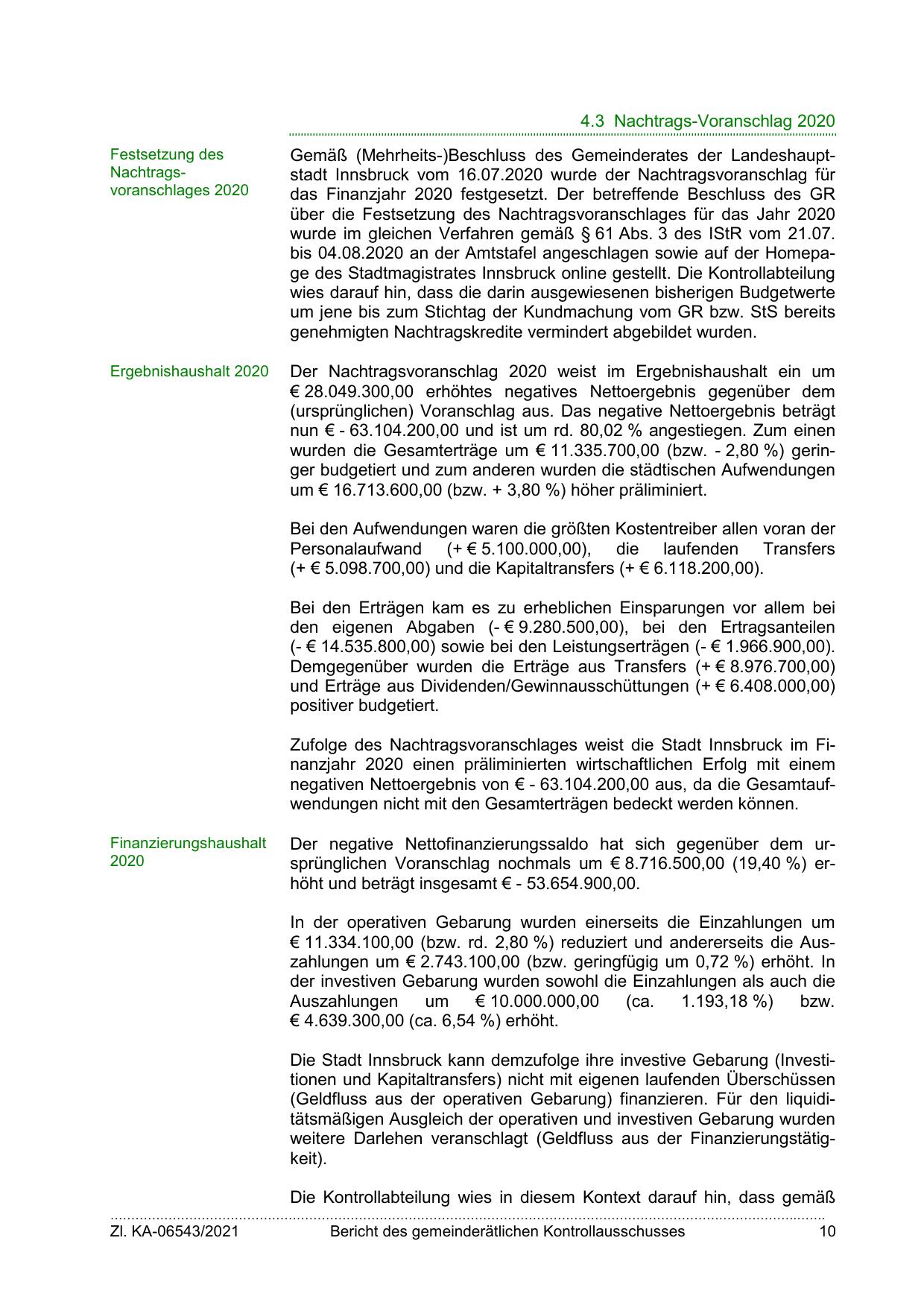 Zufolge des Nachtragsvoranschlages weist die Stadt Innsbruck im Finanzjahr 2020 einen präliminierten wirtschaftlichen Erfolg mit einem