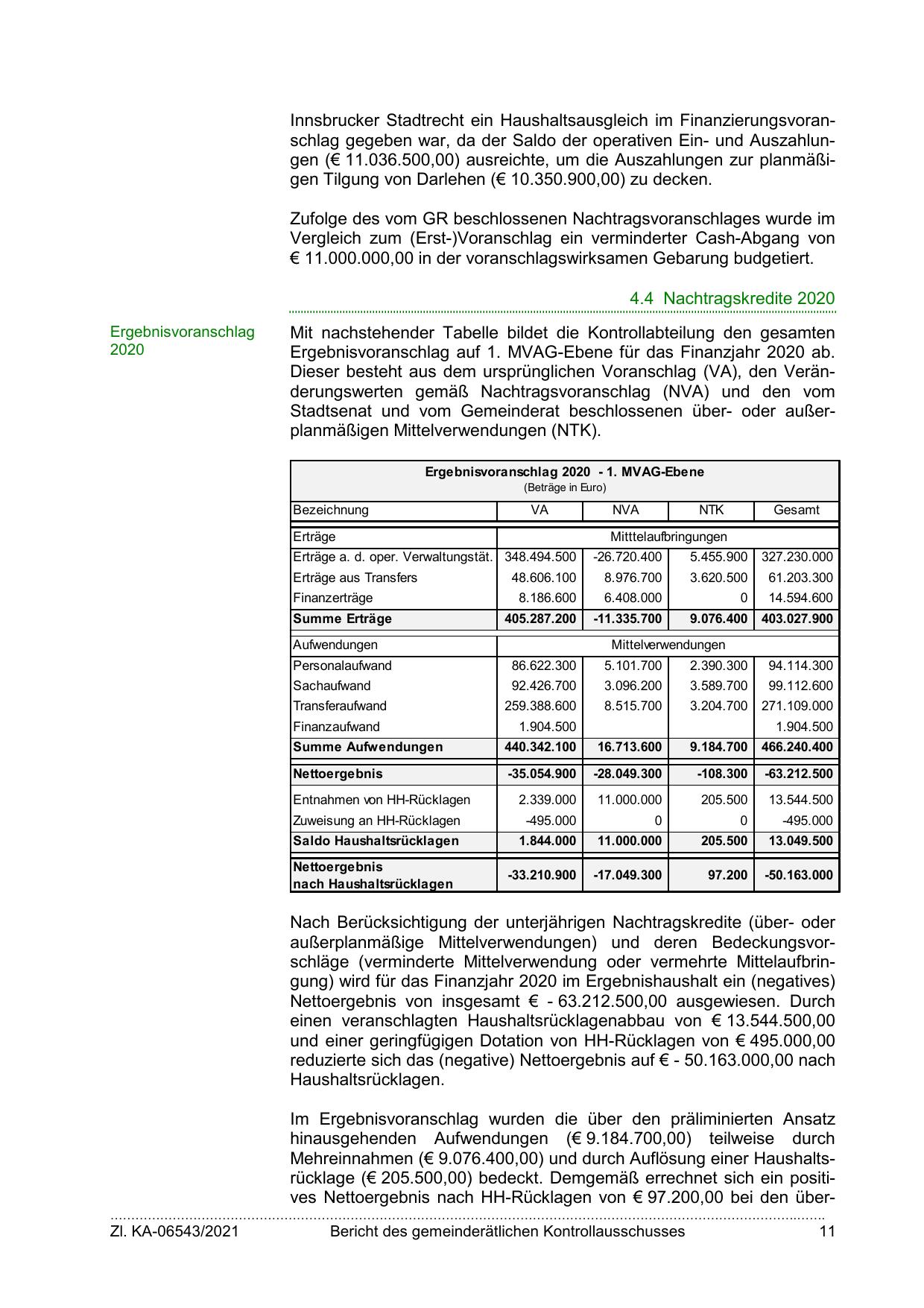 außerplanmäßige Mittelverwendungen) und deren Bedeckungsvorschläge (verminderte Mittelverwendung oder vermehrte Mittelaufbringung) wird für das Finanzjahr 2020 im Ergebnishaushalt ein (negatives)