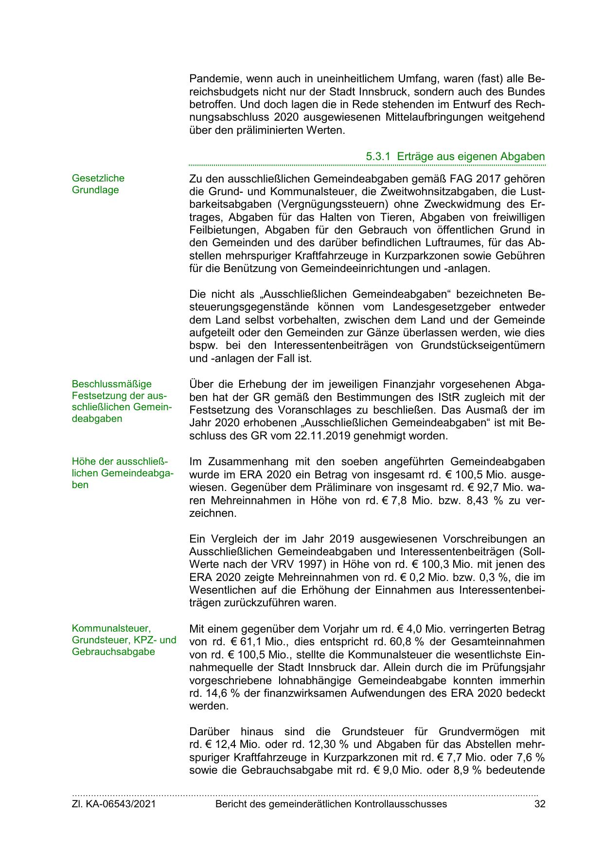 von rd. € 100,5 Mio., stellte die Kommunalsteuer die wesentlichste Einnahmequelle der Stadt Innsbruck dar. Allein durch die im Prüfungsjahr