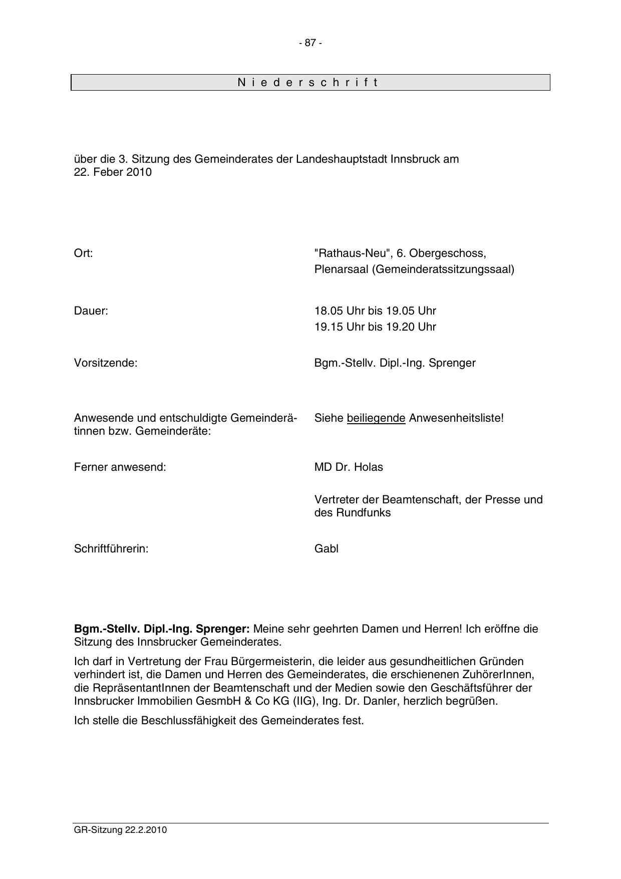 über die 3. Sitzung des Gemeinderates der Landeshauptstadt Innsbruck am