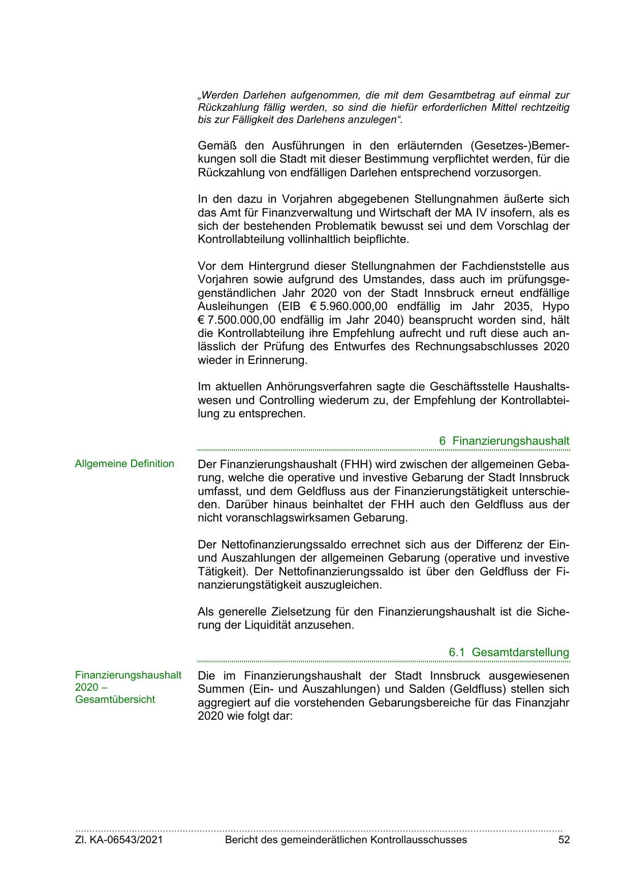 Vorjahren sowie aufgrund des Umstandes, dass auch im prüfungsgegenständlichen Jahr 2020 von der Stadt Innsbruck erneut endfällige