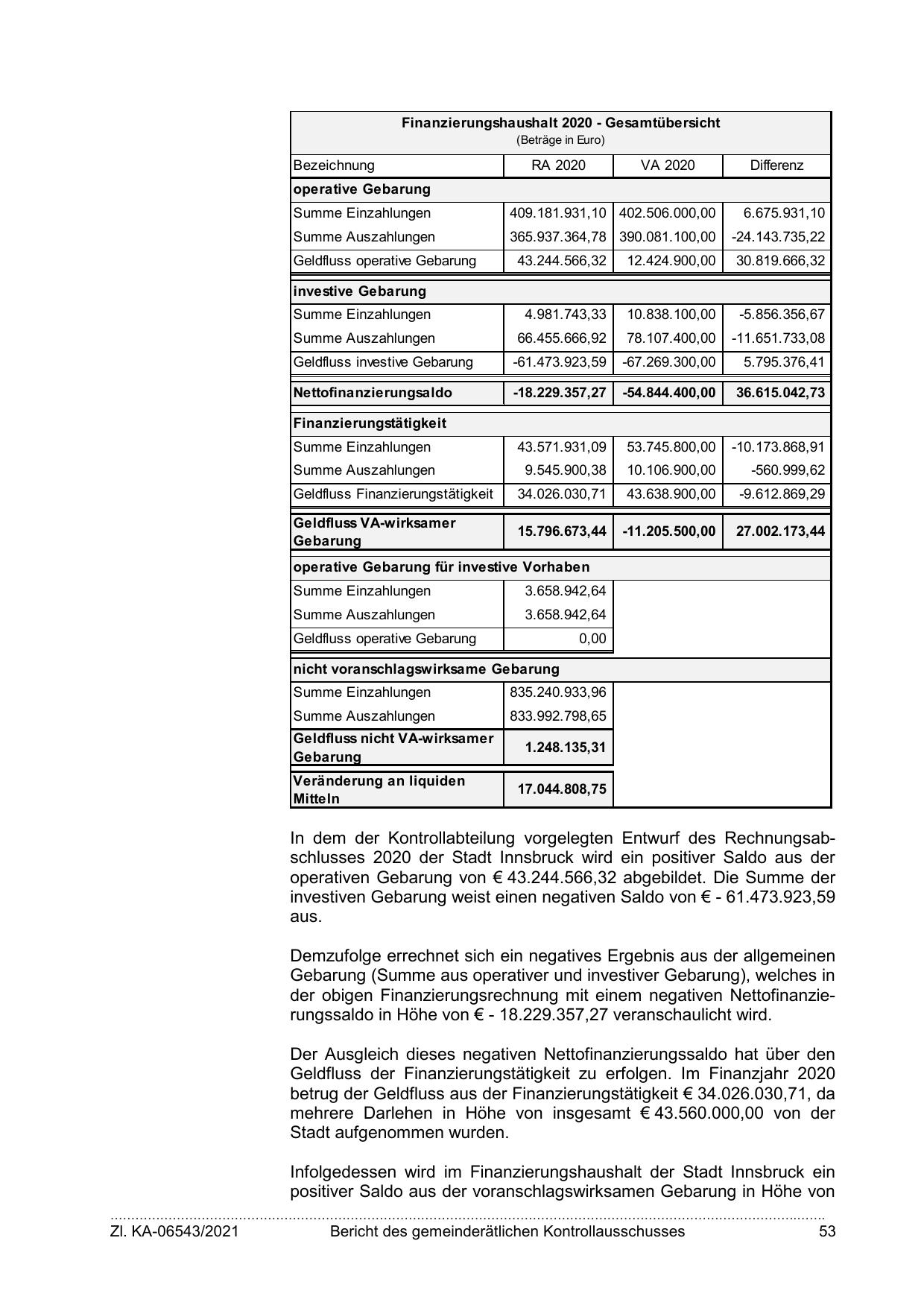 In dem der Kontrollabteilung vorgelegten Entwurf des Rechnungsabschlusses 2020 der Stadt Innsbruck wird ein positiver Saldo aus der