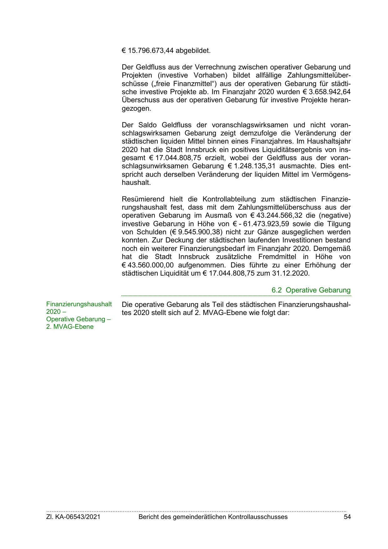 2020 hat die Stadt Innsbruck ein positives Liquiditätsergebnis von insgesamt € 17.044.808,75 erzielt, wobei der Geldfluss aus der voranschlagsunwirksamen Gebarung € 1.248.135,31 ausmachte. Dies entspricht auch derselben Veränderung der liquiden Mittel im Vermögenshaushalt.