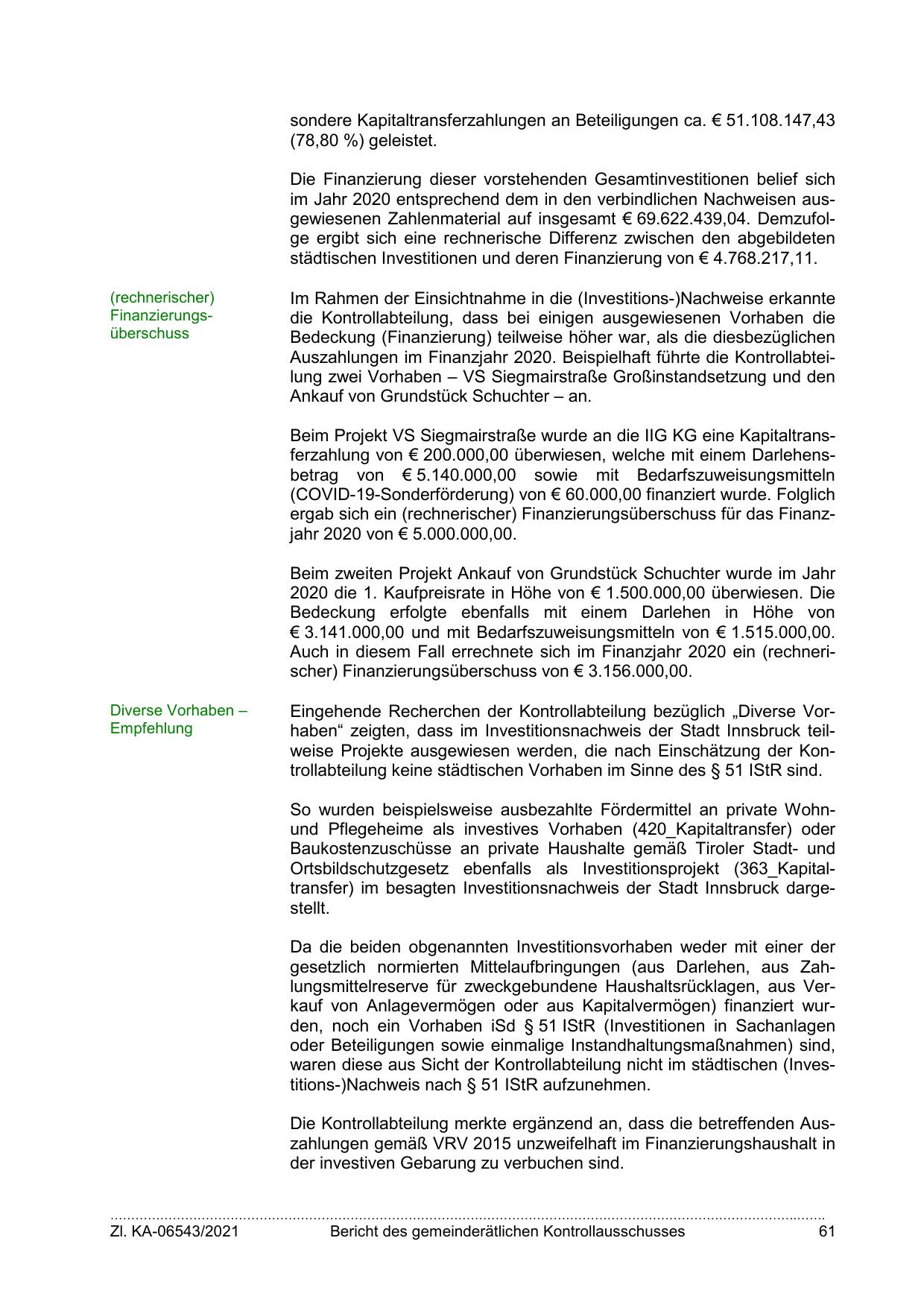 Eingehende Recherchen der Kontrollabteilung bezüglich „Diverse Vorhaben“ zeigten, dass im Investitionsnachweis der Stadt Innsbruck teilweise Projekte ausgewiesen werden, die nach Einschätzung der Kontrollabteilung keine städtischen Vorhaben im Sinne des § 51 IStR sind.
