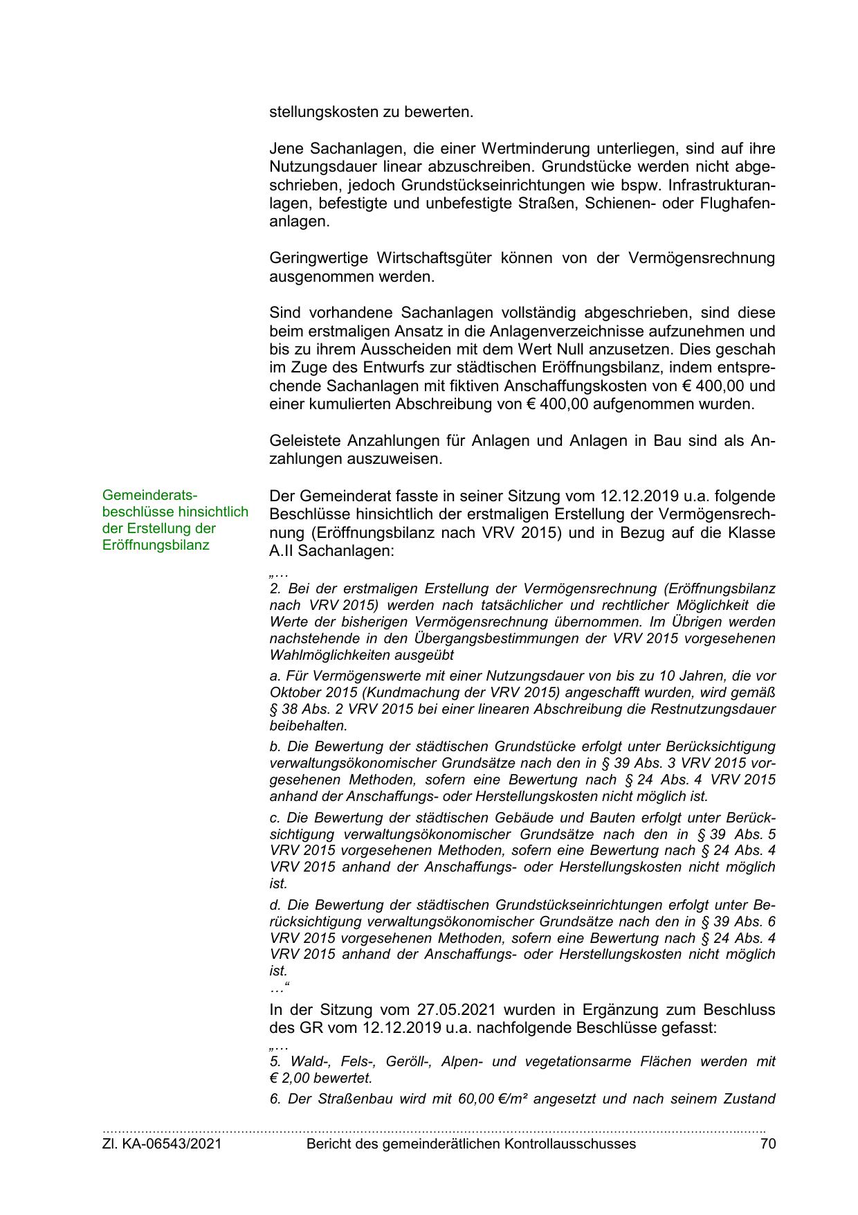 Beschlüsse hinsichtlich der erstmaligen Erstellung der Vermögensrechnung (Eröffnungsbilanz nach VRV 2015) und in Bezug auf die Klasse