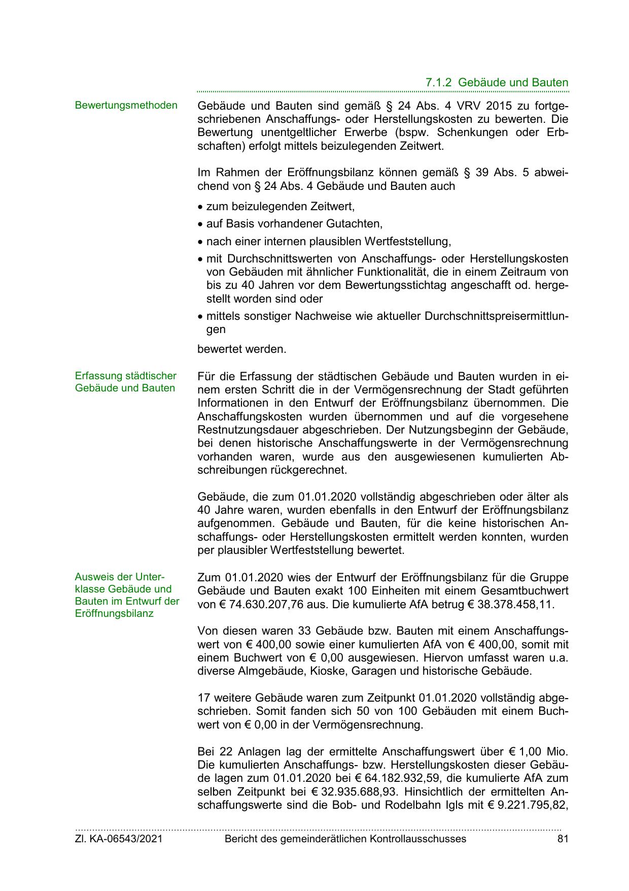 17 weitere Gebäude waren zum Zeitpunkt 01.01.2020 vollständig abgeschrieben. Somit fanden sich 50 von 100 Gebäuden mit einem Buchwert von € 0,00 in der Vermögensrechnung.