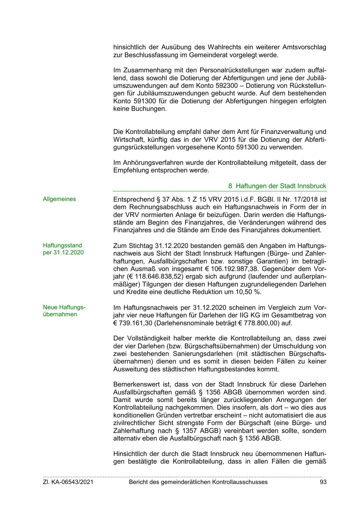 Zum Stichtag 31.12.2020 bestanden gemäß den Angaben im Haftungsnachweis aus Sicht der Stadt Innsbruck Haftungen (Bürge- und Zahlerhaftungen, Ausfallbürgschaften bzw. sonstige Garantien) im betraglichen Ausmaß von insgesamt € 106.192.987,38. Gegenüber dem Vorjahr (€ 118.646.838,52) ergab sich aufgrund (laufender und außerplanmäßiger) Tilgungen der diesen Haftungen zugrundeliegenden Darlehen
