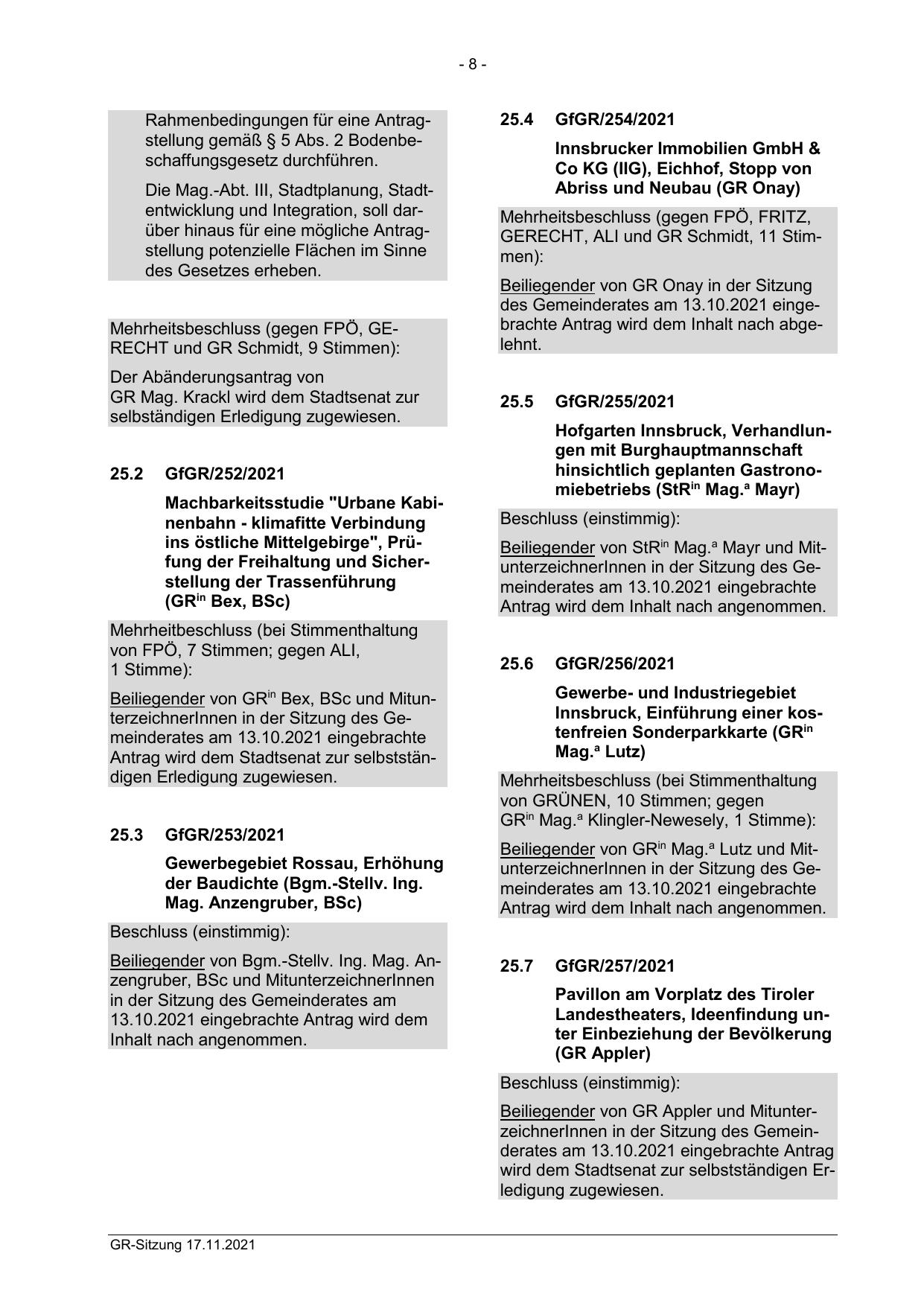 Mehrheitsbeschluss (gegen FPÖ, GERECHT und GR Schmidt, 9 Stimmen):