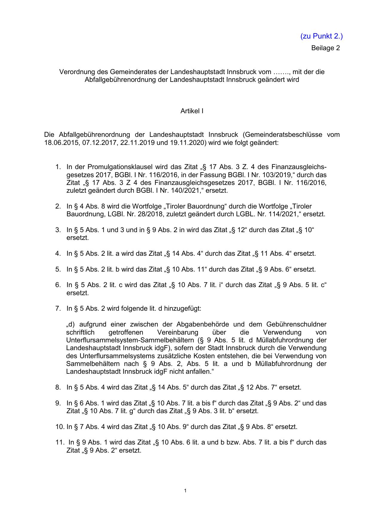 Abfallgebührenordnung der Landeshauptstadt Innsbruck geändert wird