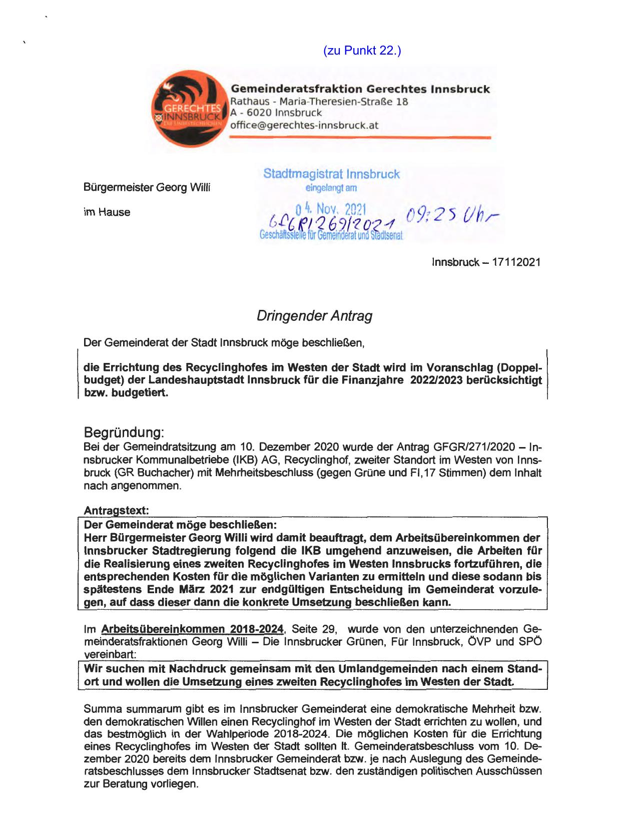 Bei der Gemeindratsitzung am 10. Dezember 2020 wurde der Antrag GFGR/271/2020 - lnnsbrucker Kommunalbetriebe (1KB) AG, Recyclinghof, zweiter Standort im Westen von Innsbruck (GR Buchacher) mit Mehrheitsbeschluss (gegen Grüne und FI, 17 Stimmen) dem Inhalt