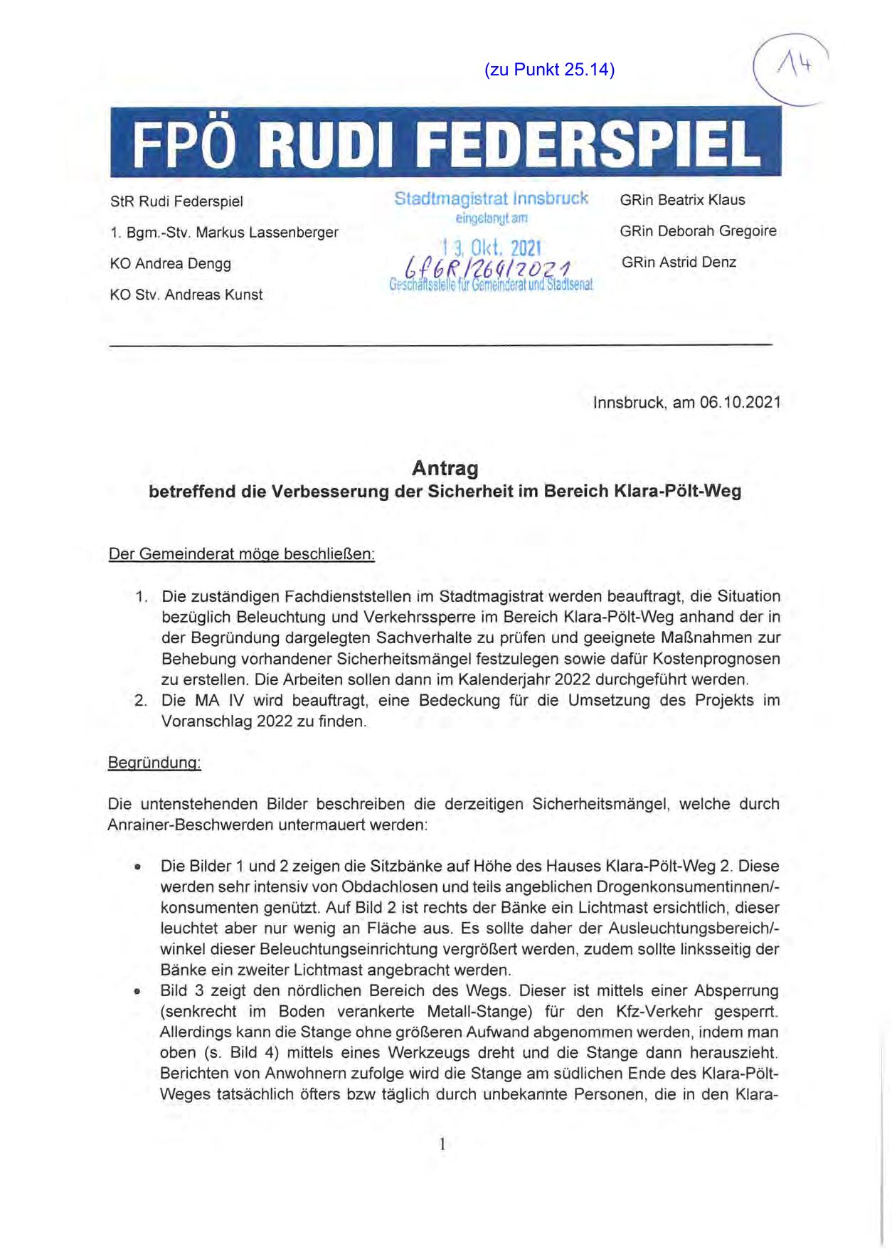 betreffend die Verbesserung der Sicherheit im Bereich Klara-Pölt-Weg
