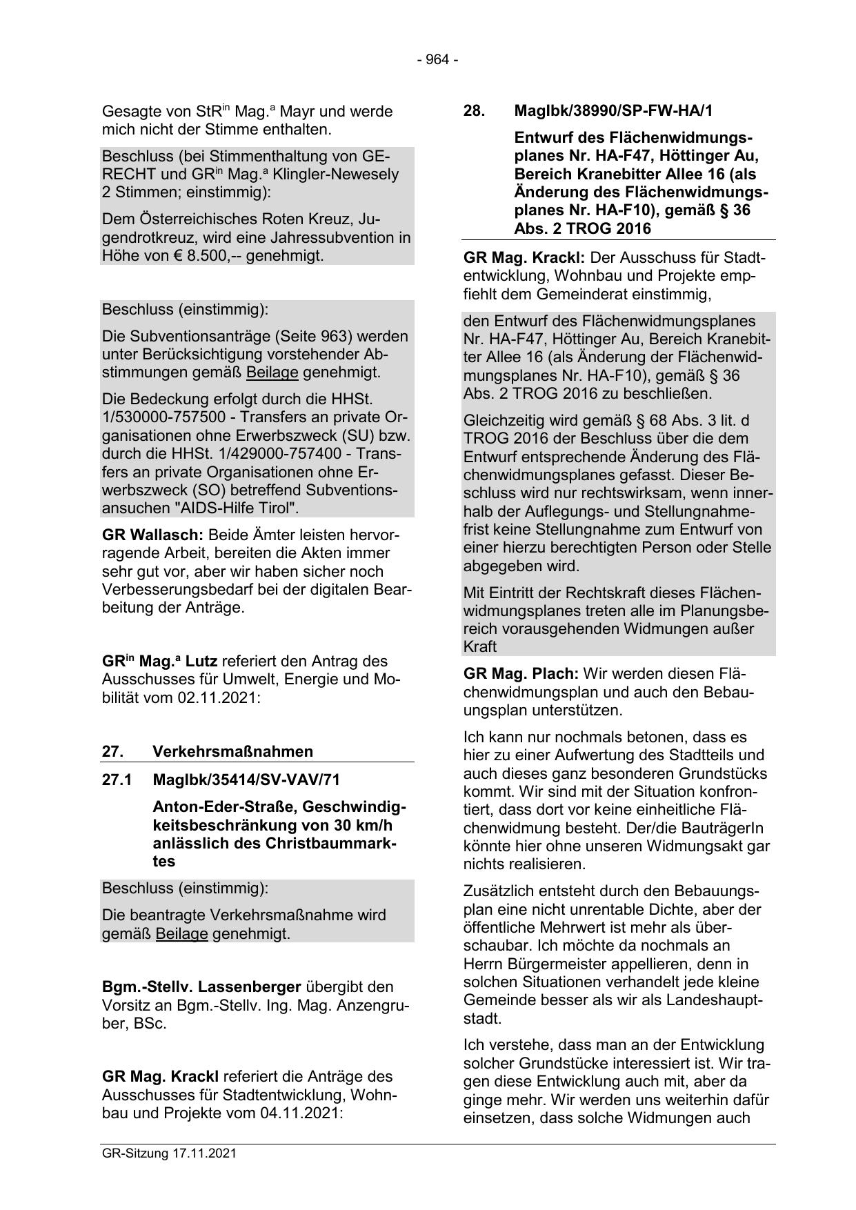 Nr. HA-F47, Höttinger Au, Bereich Kranebitter Allee 16 (als Änderung der Flächenwidmungsplanes Nr. HA-F10), gemäß § 36
