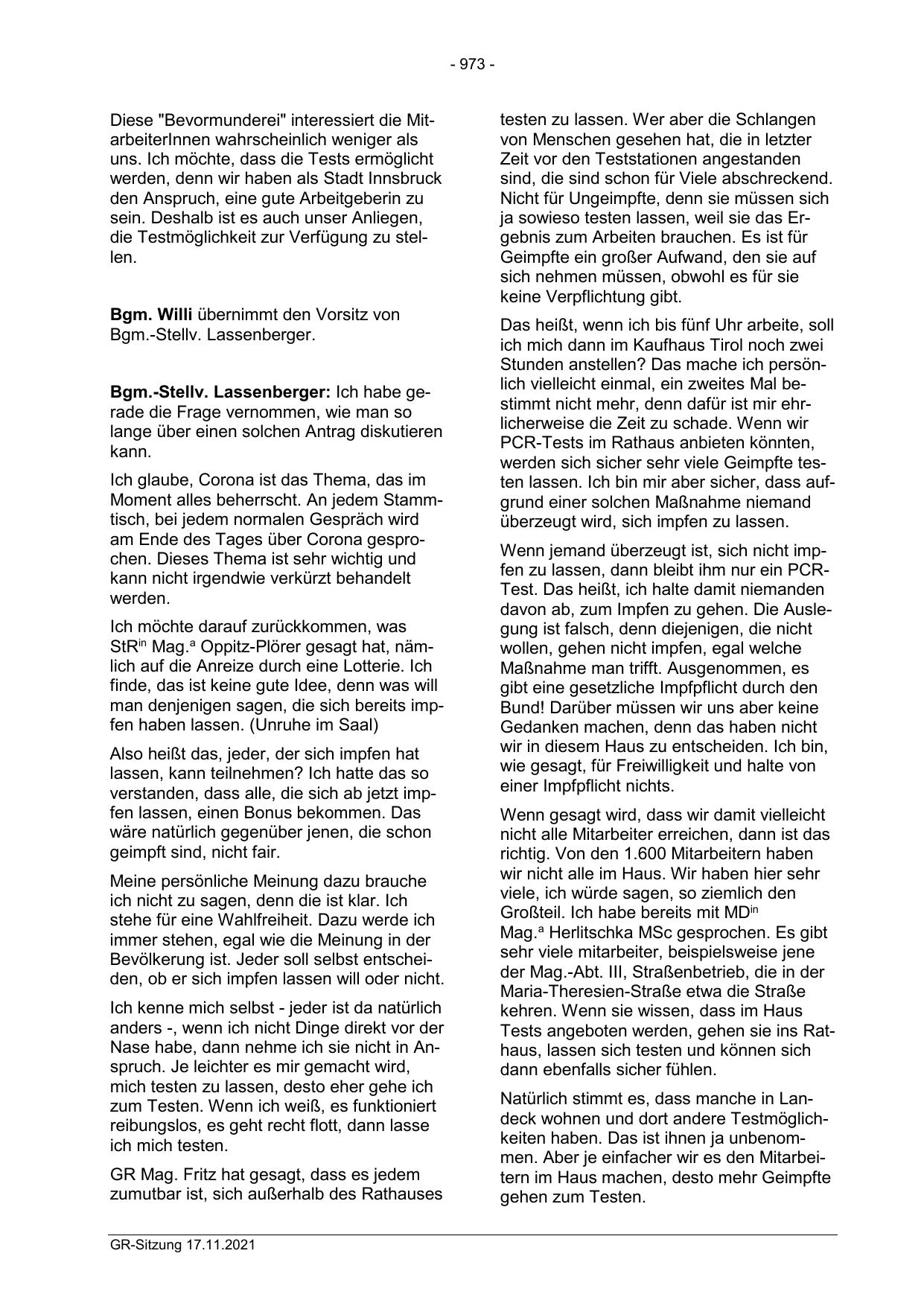 Natürlich stimmt es, dass manche in Landeck wohnen und dort andere Testmöglichkeiten haben. Das ist ihnen ja unbenommen. Aber je einfacher wir es den Mitarbeitern im Haus machen, desto mehr Geimpfte