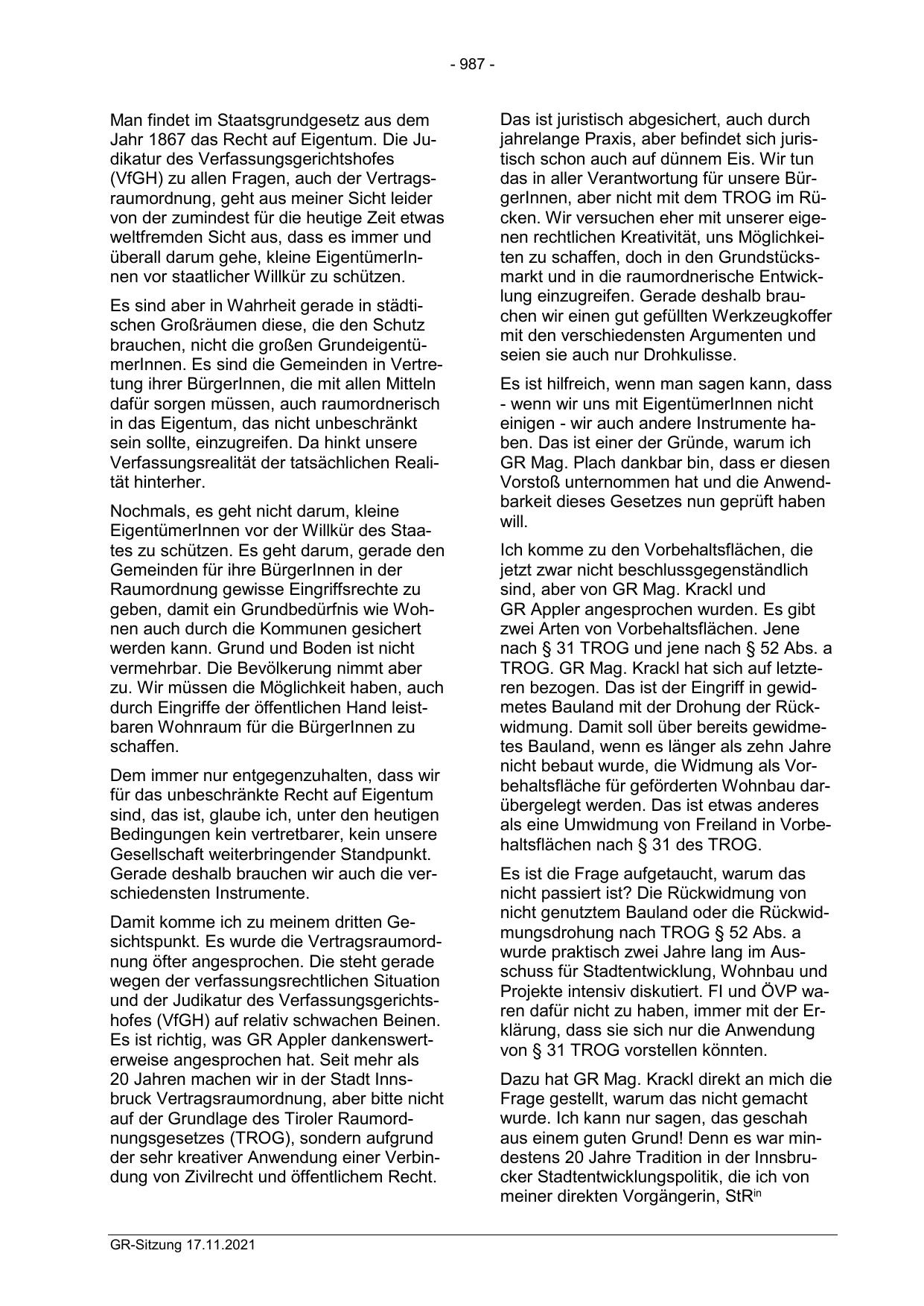 20 Jahren machen wir in der Stadt Innsbruck Vertragsraumordnung, aber bitte nicht