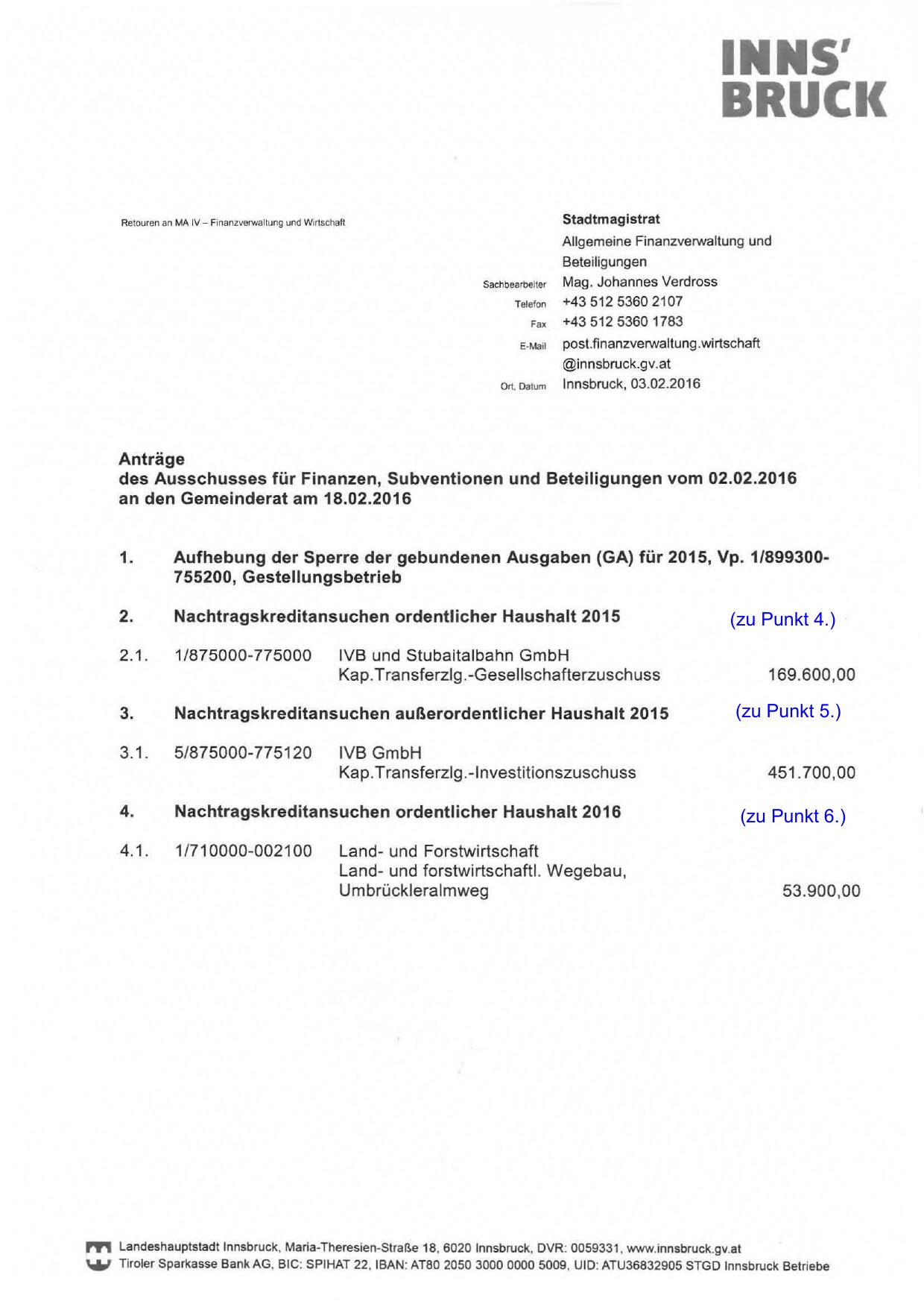 Nachtragskreditansuchen ordentlicher Haushalt 2016