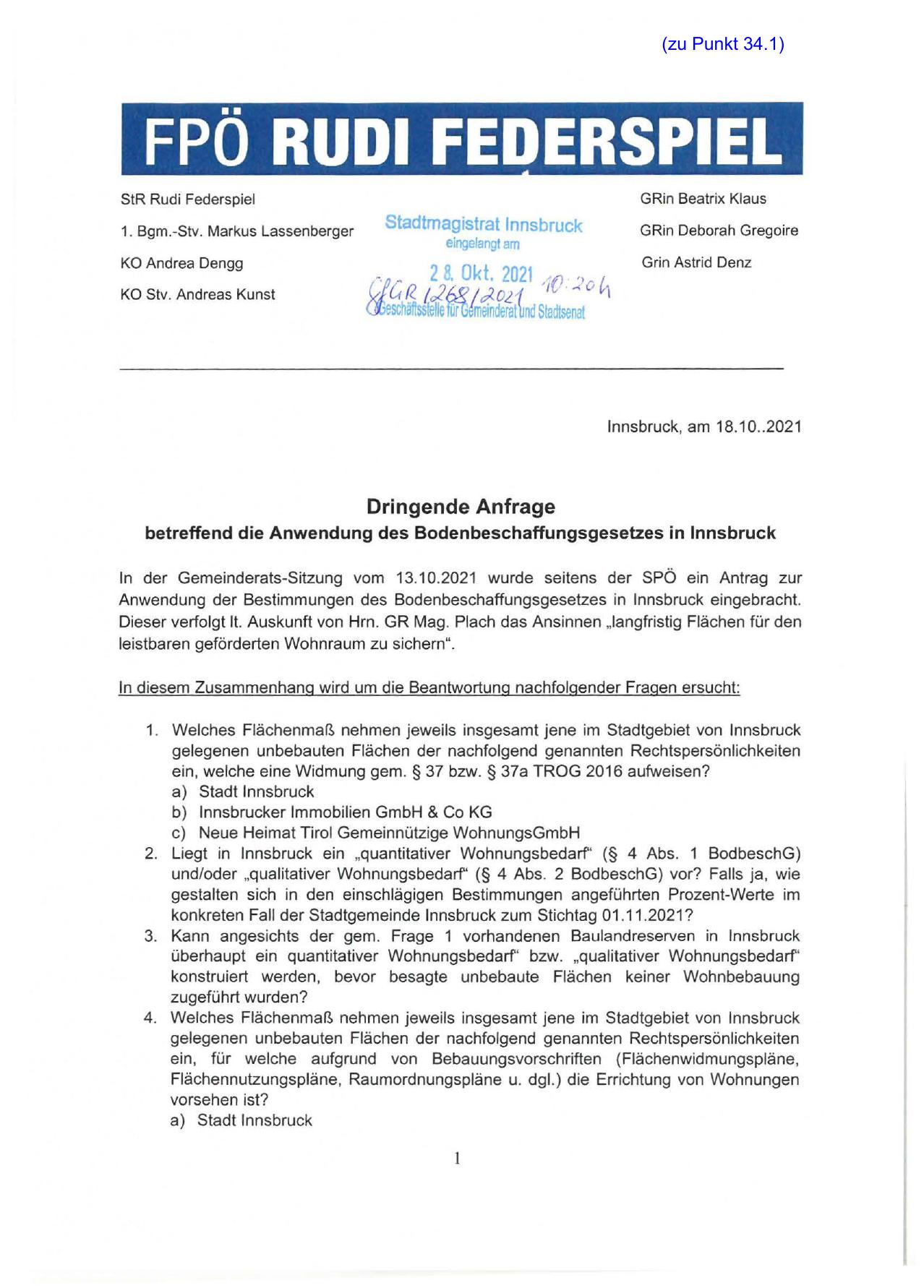 Anwendung der Bestimmungen des Bodenbeschaffungsgesetzes in Innsbruck eingebracht.