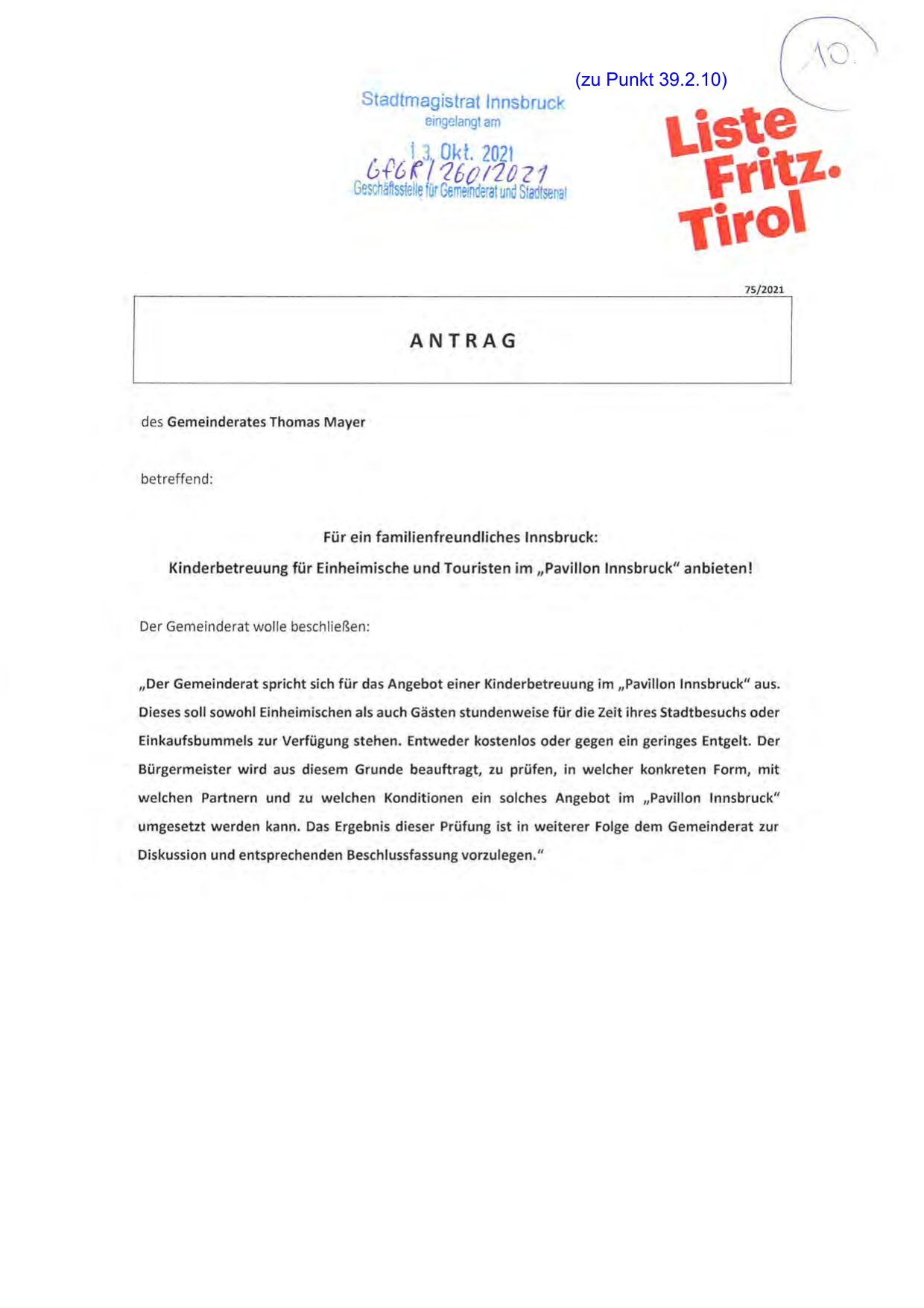 ,,Der Gemeinderat spricht sich für das Angebot einer Kinderbetreuung im „Pavillon Innsbruck" aus.