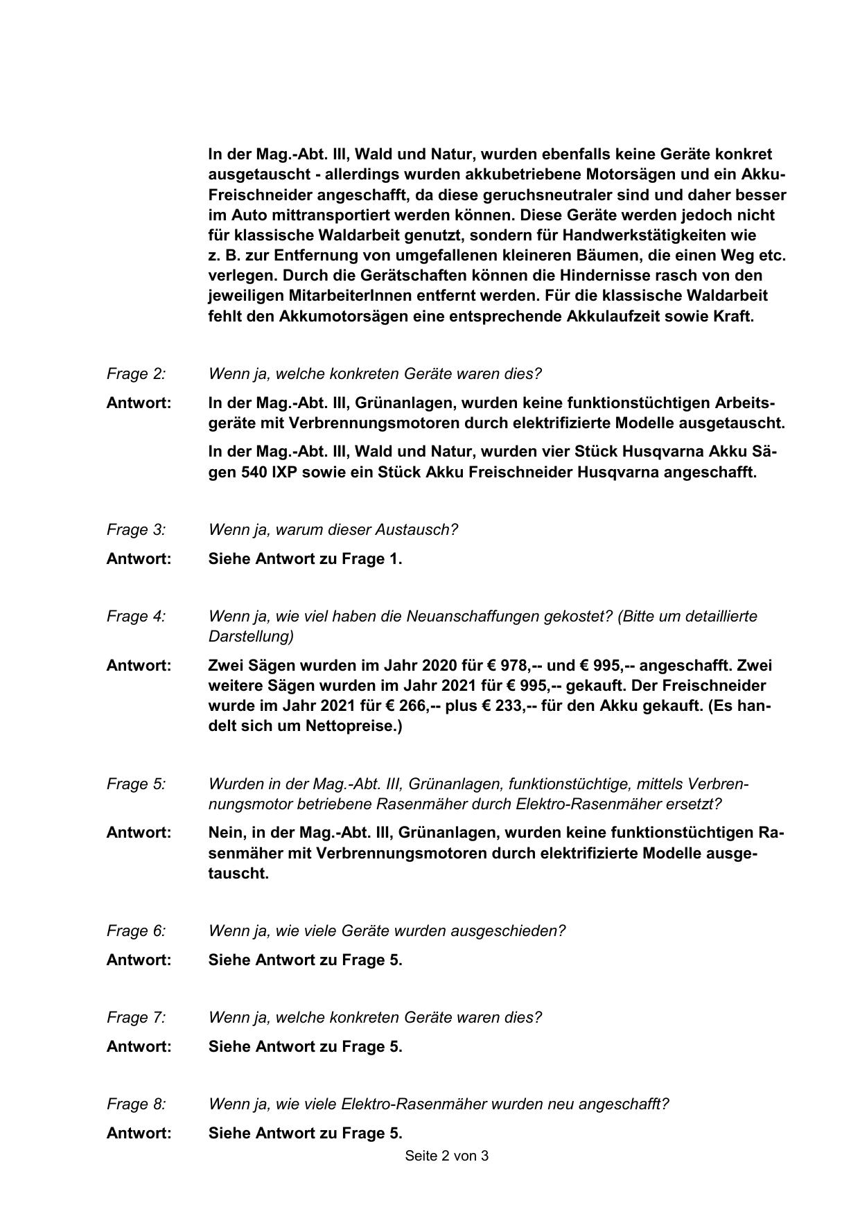In der Mag.-Abt. III, Grünanlagen, wurden keine funktionstüchtigen Arbeitsgeräte mit Verbrennungsmotoren durch elektrifizierte Modelle ausgetauscht.