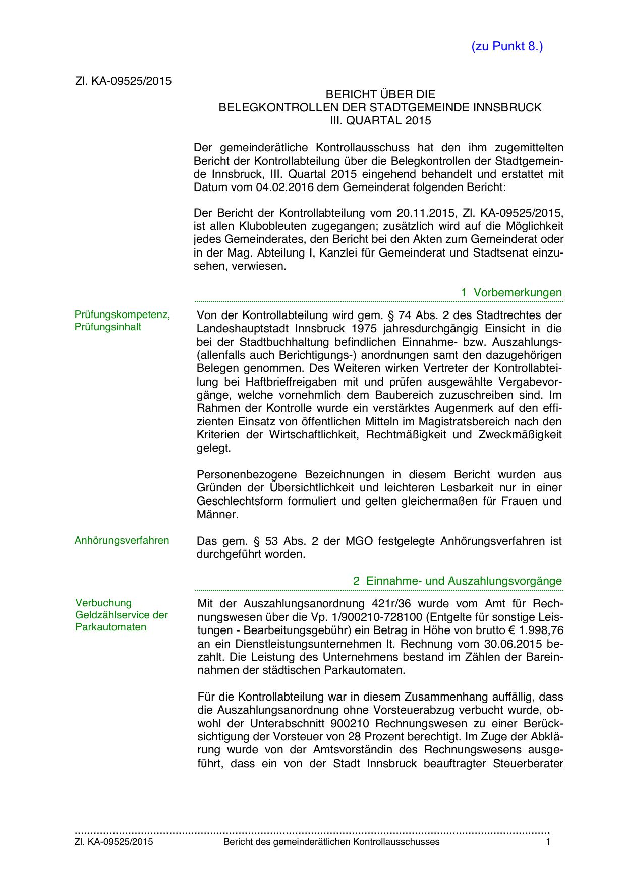 Bericht der Kontrollabteilung über die Belegkontrollen der Stadtgemeinde Innsbruck, III. Quartal 2015 eingehend behandelt und erstattet mit