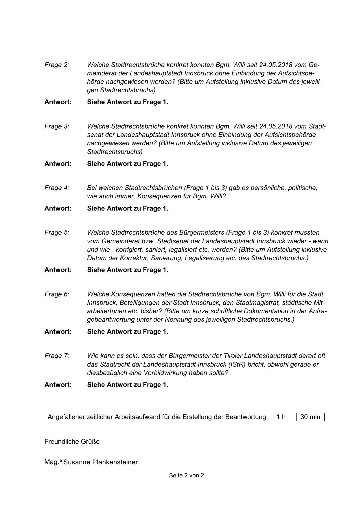 Welche Stadtrechtsbrüche konkret konnten Bgm. Willi seit 24.05.2018 vom Gemeinderat der Landeshauptstadt Innsbruck ohne Einbindung der Aufsichtsbehörde nachgewiesen werden? (Bitte um Aufstellung inklusive Datum des jeweiligen Stadtrechtsbruchs)