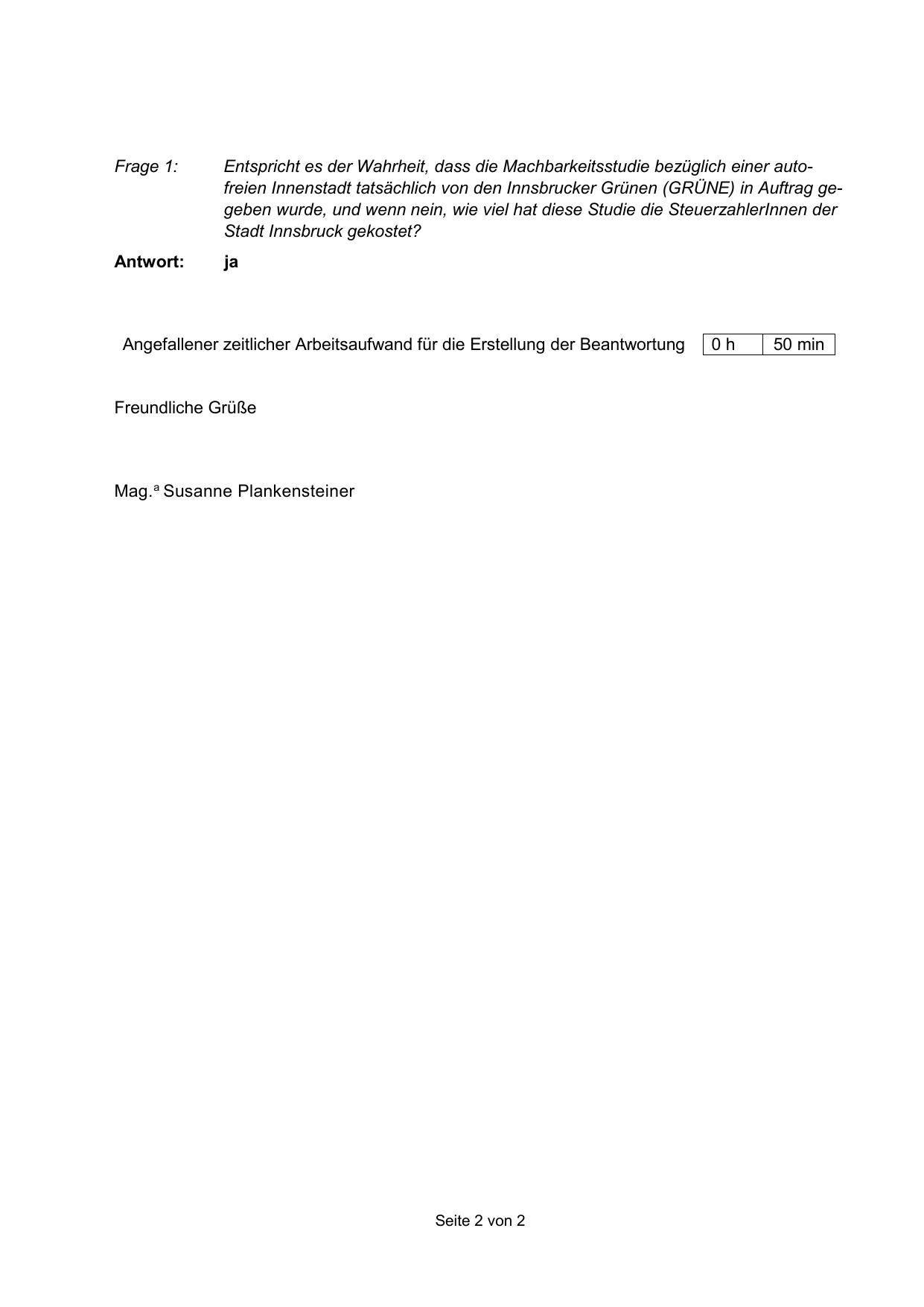 Entspricht es der Wahrheit, dass die Machbarkeitsstudie bezüglich einer autofreien Innenstadt tatsächlich von den Innsbrucker Grünen (GRÜNE) in Auftrag gegeben wurde, und wenn nein, wie viel hat diese Studie die SteuerzahlerInnen der