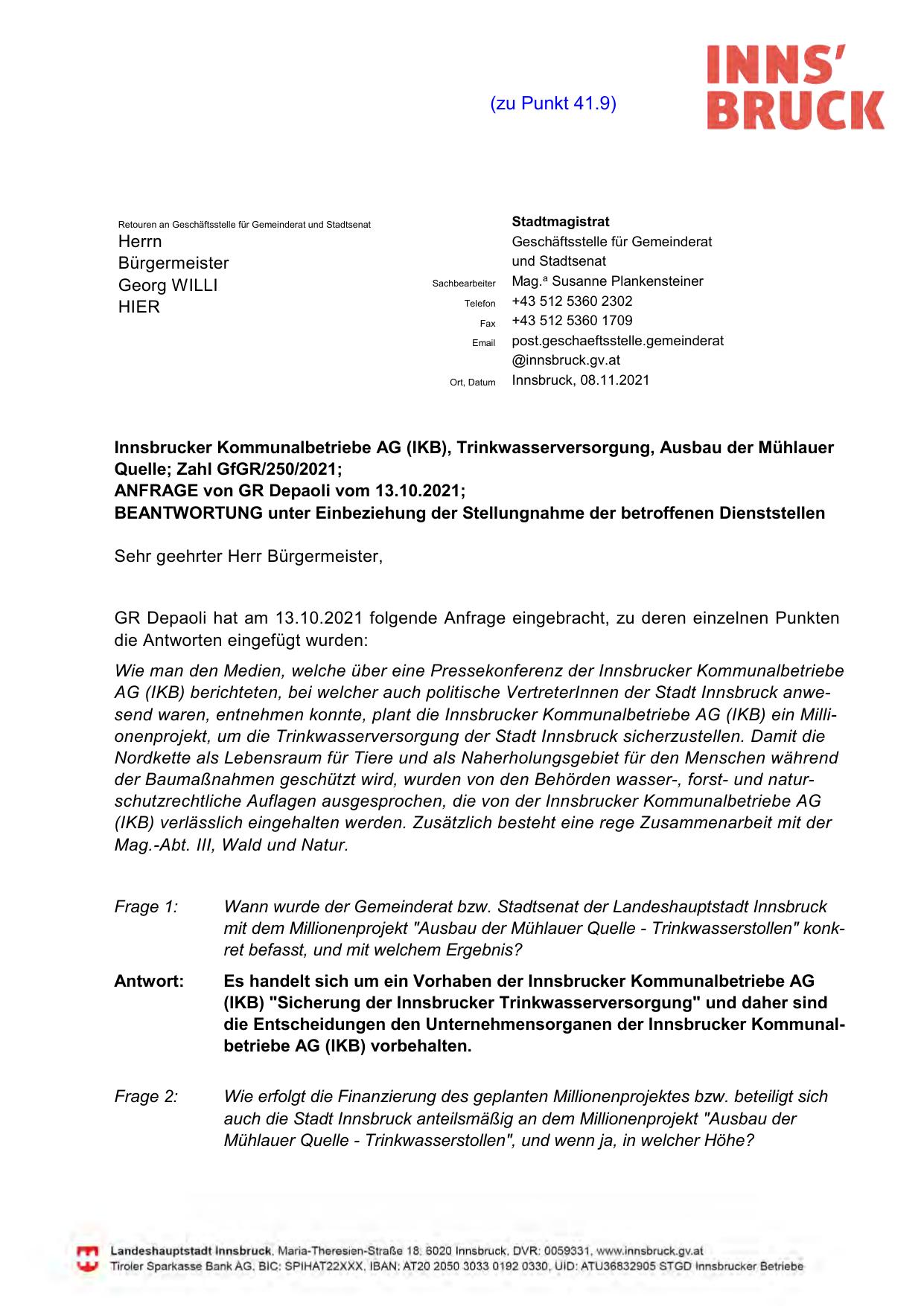 GR Depaoli hat am 13.10.2021 folgende Anfrage eingebracht, zu deren einzelnen Punkten