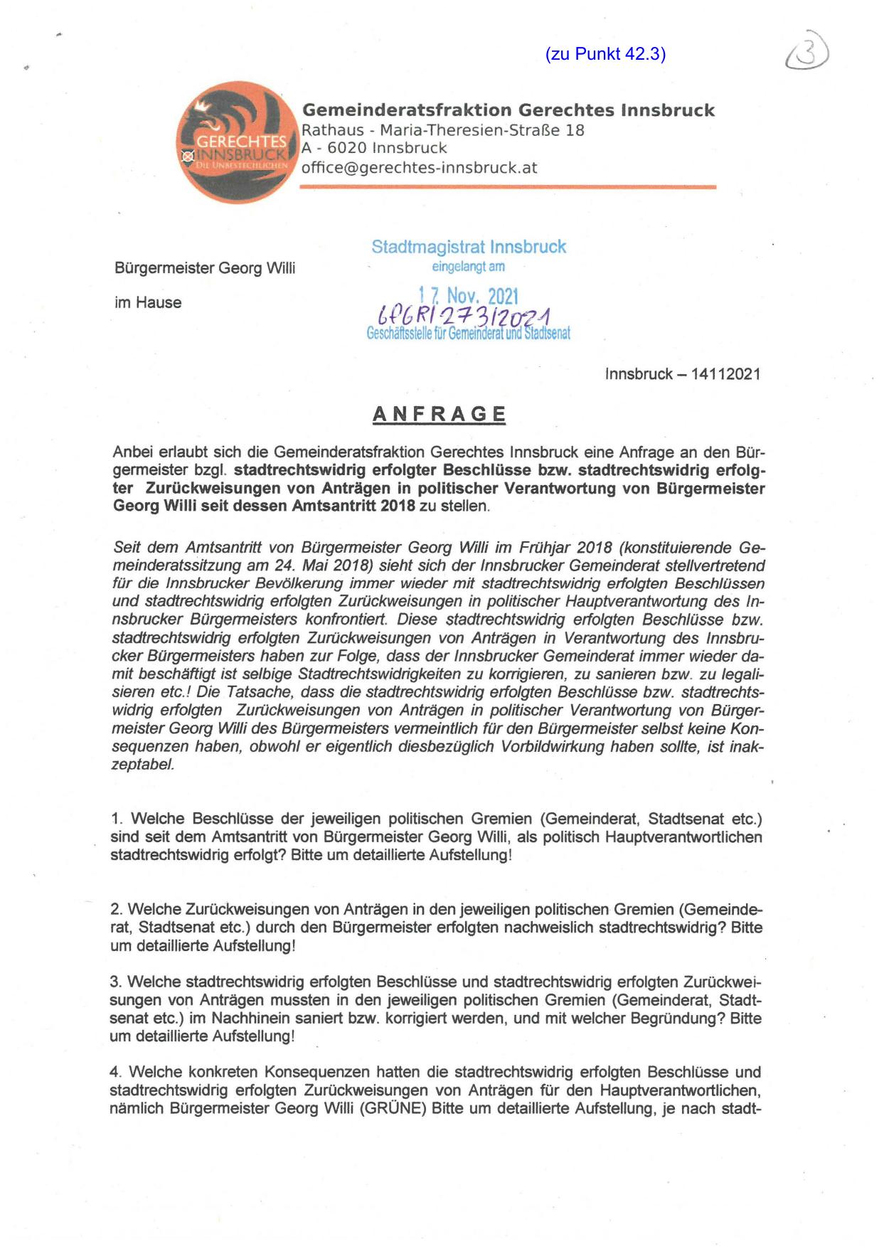 Anbei erlaubt sich die Gemeinderatsfraktion Gerechtes Innsbruck eine Anfrage an den Bürgermeister bzgl. stadtrechtswidrig erfolgter Beschlüsse bzw. stadtrechtswidrig erfolgter Zurückweisungen von Anträgen in politischer Verantwortung von Bürgermeister