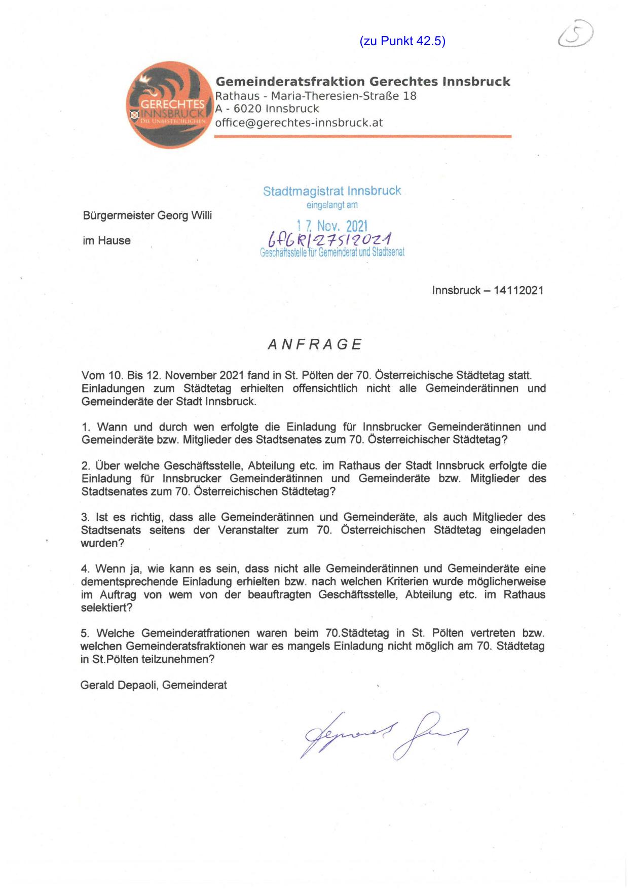2. Über welche Geschäftsstelle, Abteilung etc. im Rathaus der Stadt Innsbruck erfolgte die
