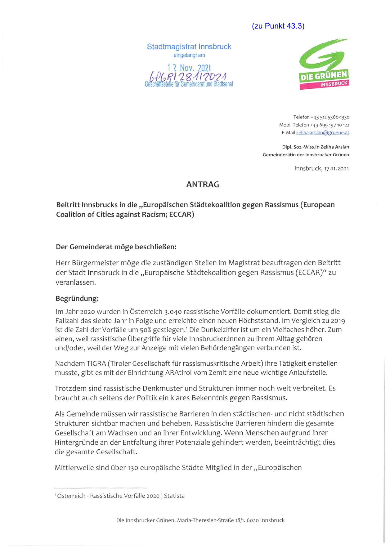 der Stadt Innsbruck in die „Europäische Städtekoalition gegen Rassismus (ECCAR)" zu