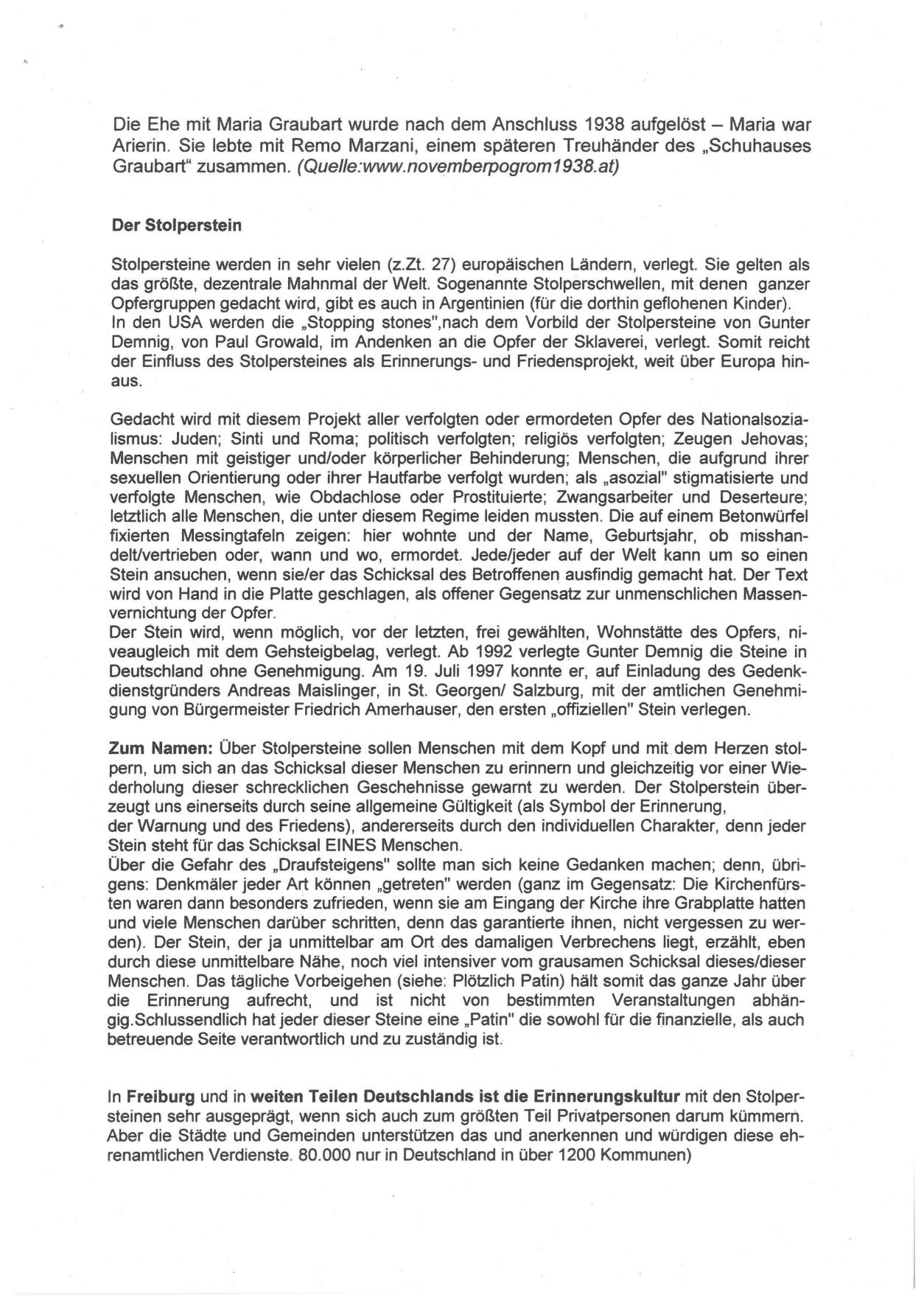 Zum Namen: Über Stolpersteine sollen Menschen mit dem Kopf und mit.dem Herzen stolpern, um sich an das Schicksal dieser Menschen zu erinnern und gleichzeitig vor einer Wiederholung dieser schrecklichen Geschehnisse gewarnt zu werden . Der Stolperstein überzeugt uns einerseits durch seine allgemeine Gültigkeit (als Symbol der Erinnerung,