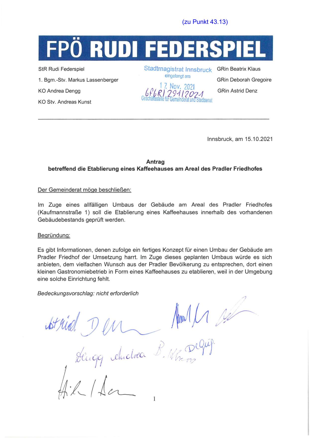 betreffend die Etablierung eines Kaffeehauses am Areal des Pradler Friedhofes
