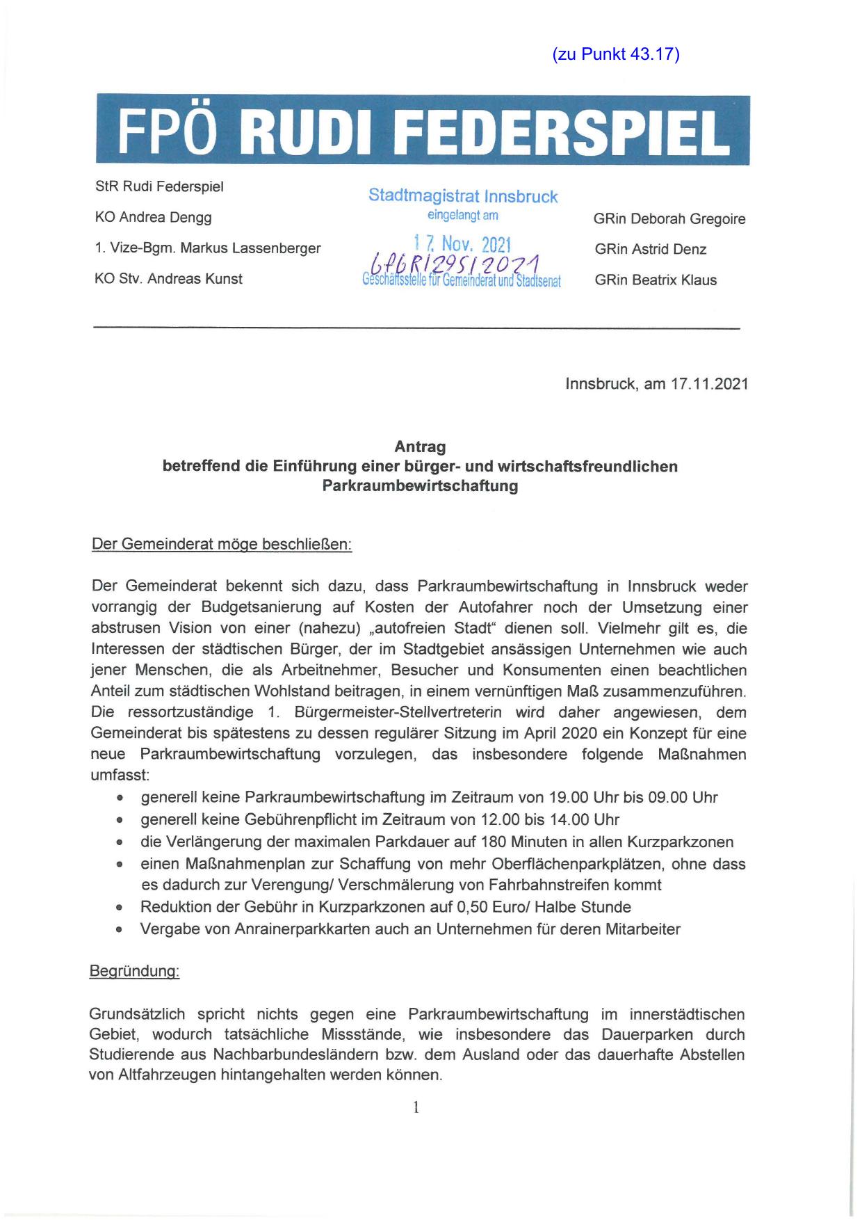 Der Gemeinderat bekennt sich dazu, dass Parkraumbewirtschaftung in Innsbruck weder