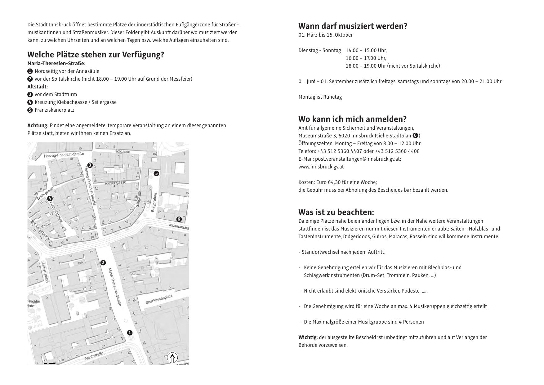 Die Stadt Innsbruck öffnet bestimmte Plätze der innerstädtischen Fußgängerzone für Straßenmusikantinnen und Straßenmusiker. Dieser Folder gibt Auskunft darüber wo musiziert werden