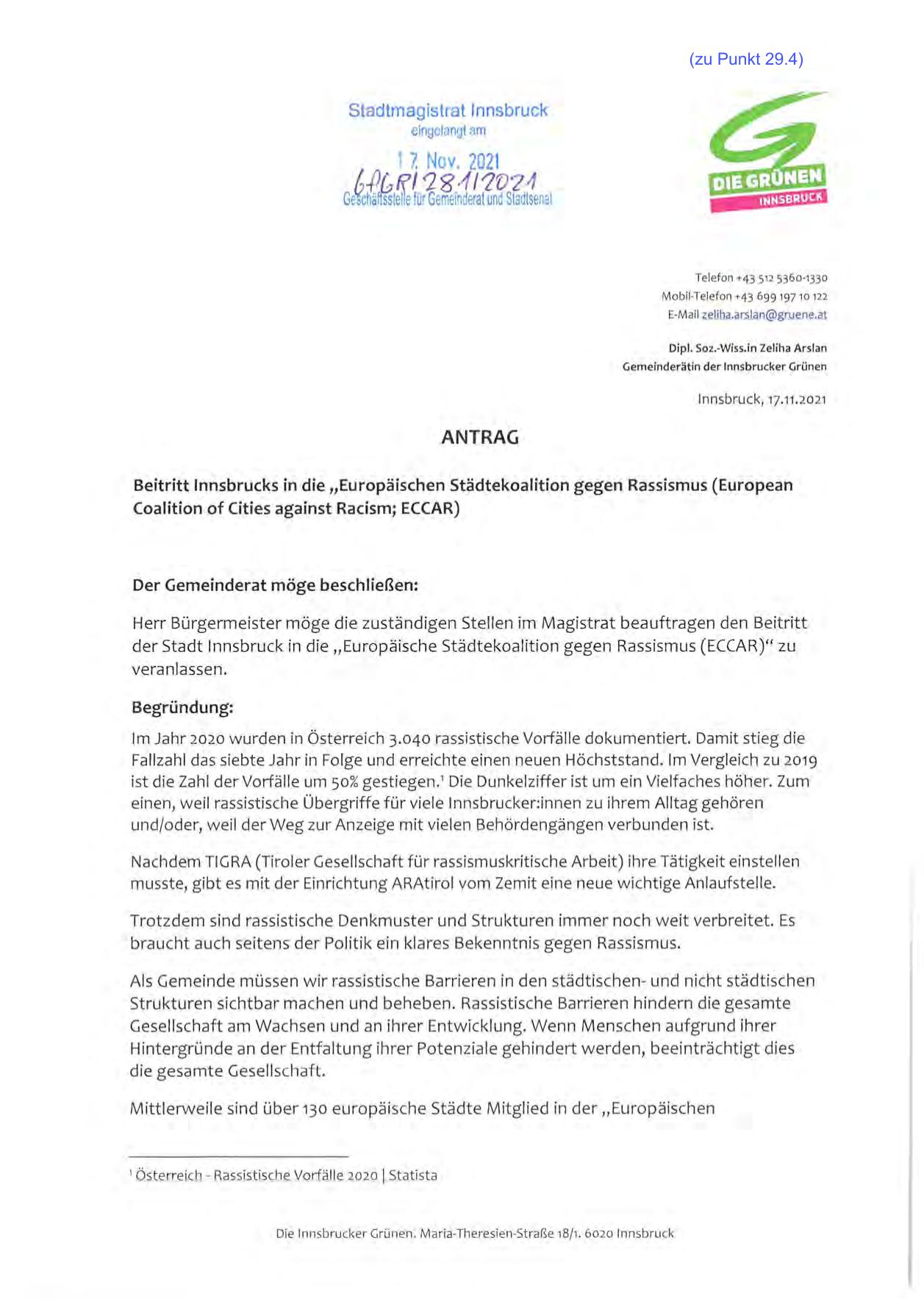 der Stadt Innsbruck in die „Europäische Städtekoalition gegen Rassismus (ECCAR)" zu