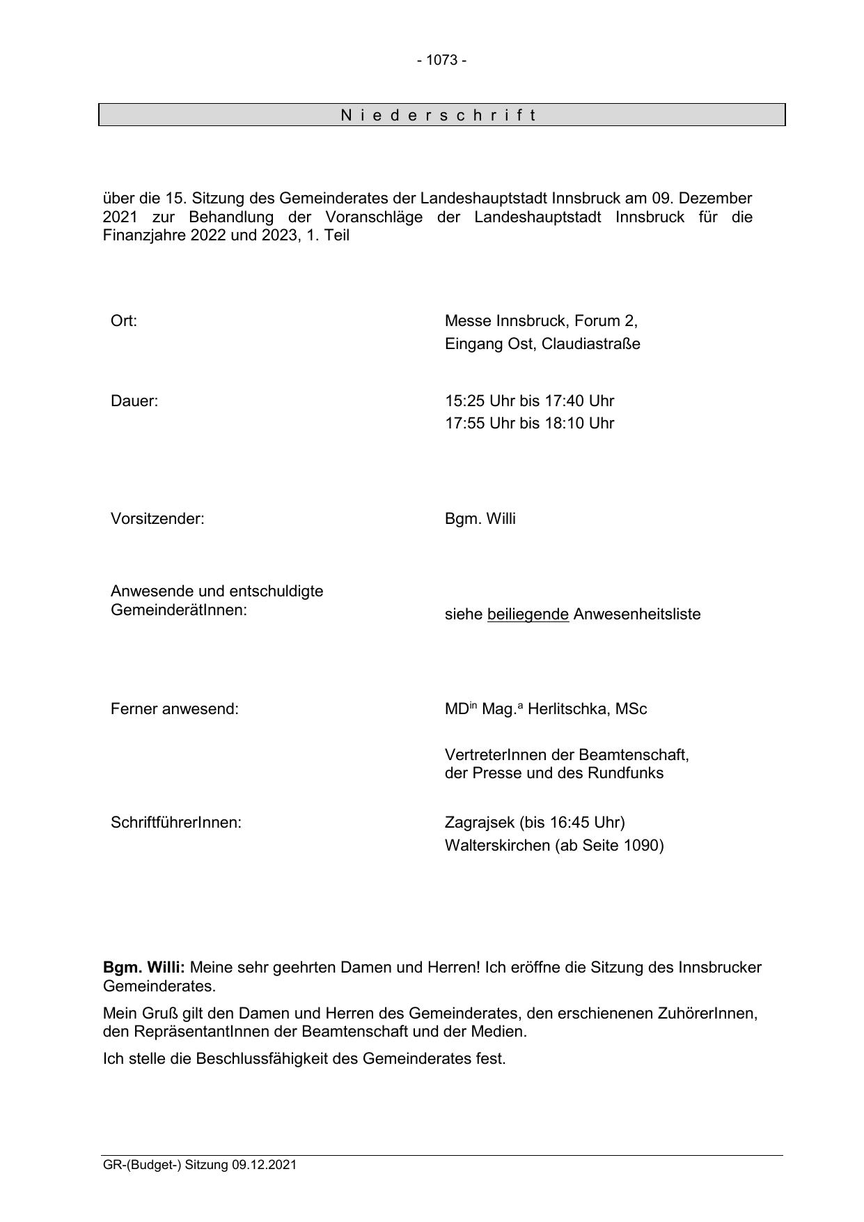 Bgm. Willi: Meine sehr geehrten Damen und Herren! Ich eröffne die Sitzung des Innsbrucker