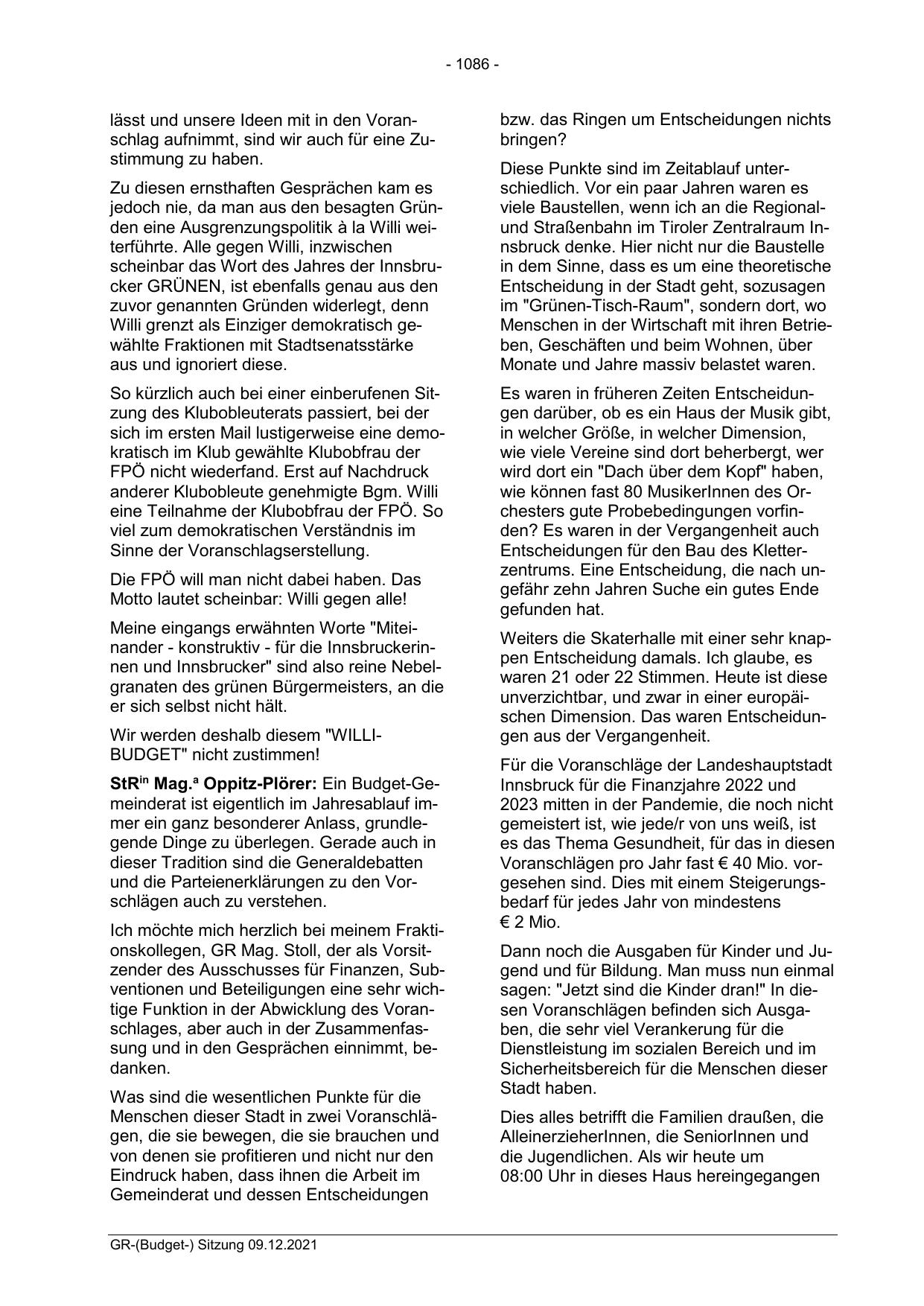 StRin Mag.a Oppitz-Plörer: Ein Budget-Gemeinderat ist eigentlich im Jahresablauf immer ein ganz besonderer Anlass, grundlegende Dinge zu überlegen. Gerade auch in