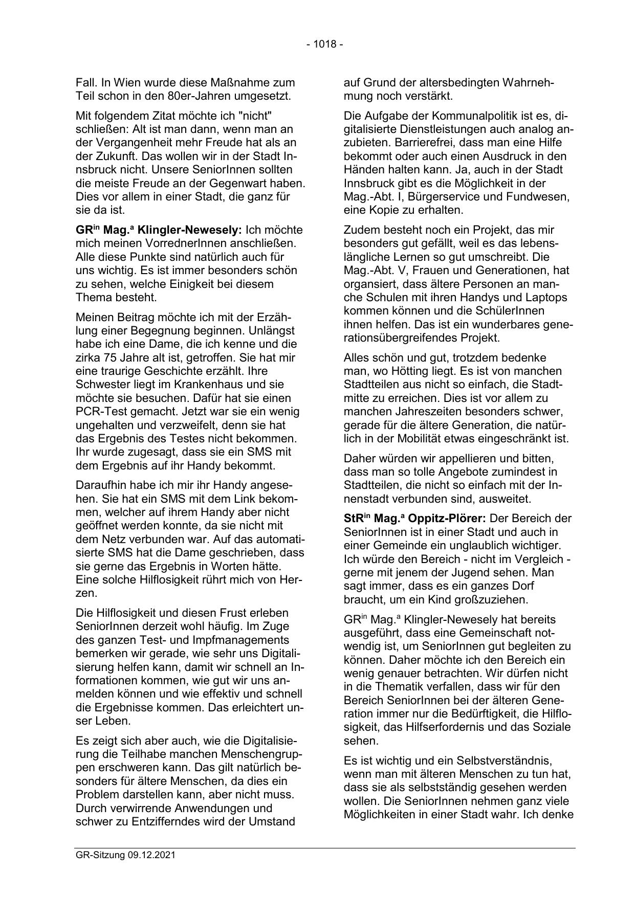 der Zukunft. Das wollen wir in der Stadt Innsbruck nicht. Unsere SeniorInnen sollten