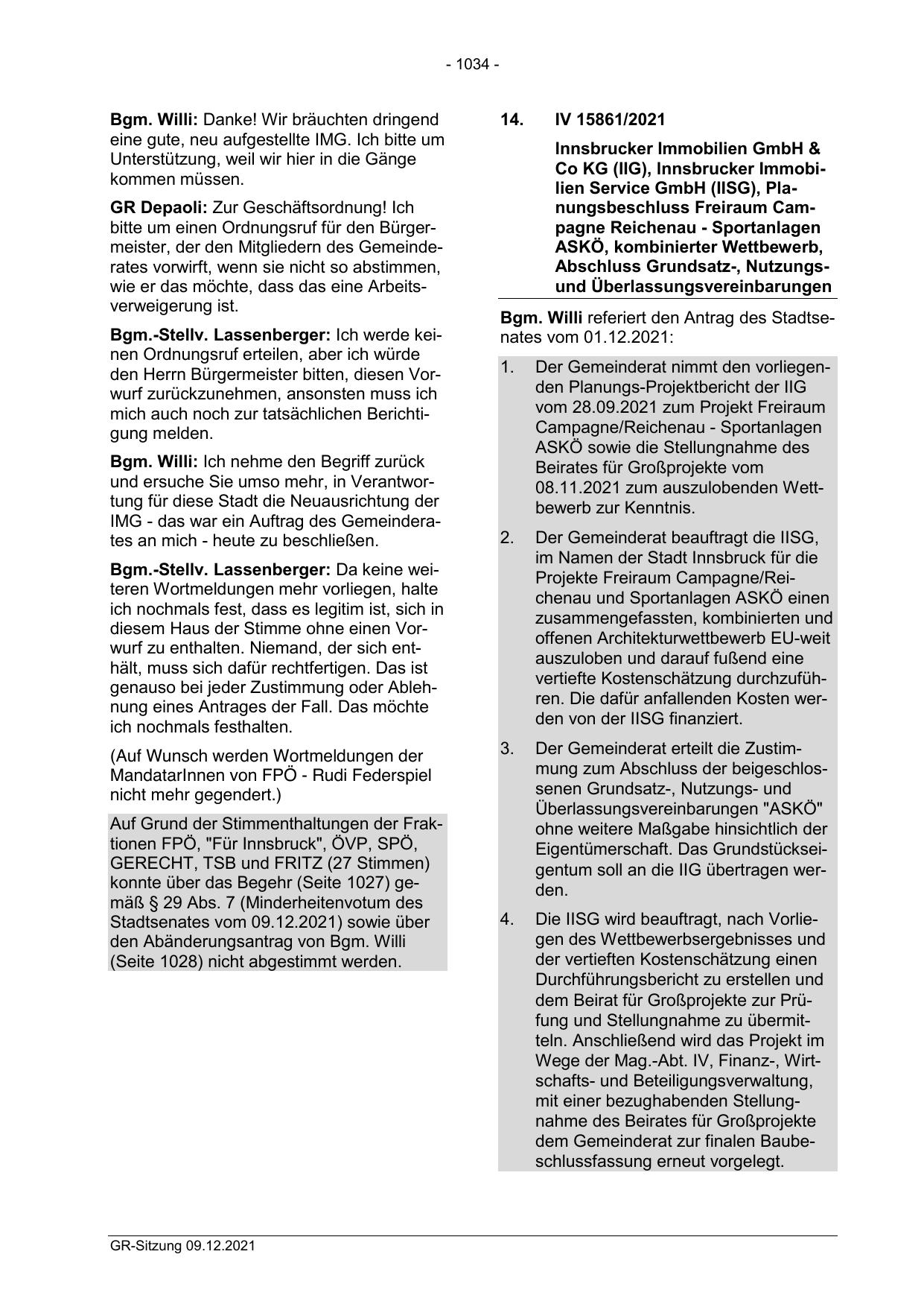 Auf Grund der Stimmenthaltungen der Fraktionen FPÖ, "Für Innsbruck", ÖVP, SPÖ,