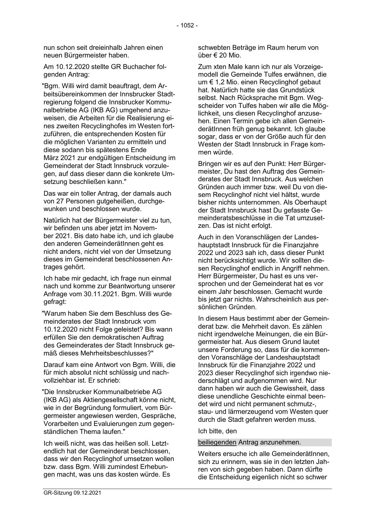 "Bgm. Willi wird damit beauftragt, dem Arbeitsübereinkommen der Innsbrucker Stadtregierung folgend die Innsbrucker Kommunalbetriebe AG (IKB AG) umgehend anzuweisen, die Arbeiten für die Realisierung eines zweiten Recyclinghofes im Westen fortzuführen, die entsprechenden Kosten für
