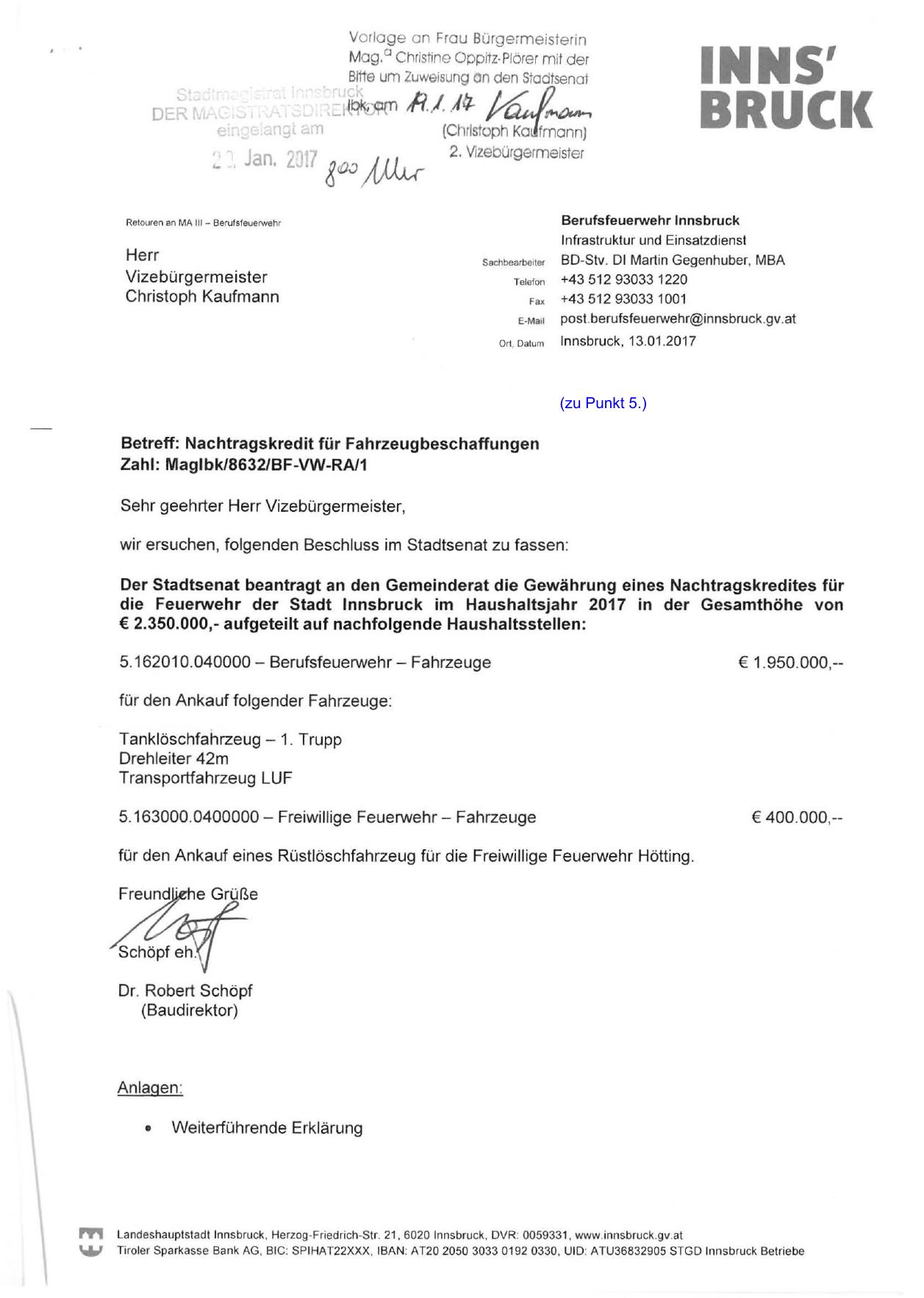 die Feuerwehr der Stadt Innsbruck im Haushaltsjahr 2017 in der Gesamthöhe von