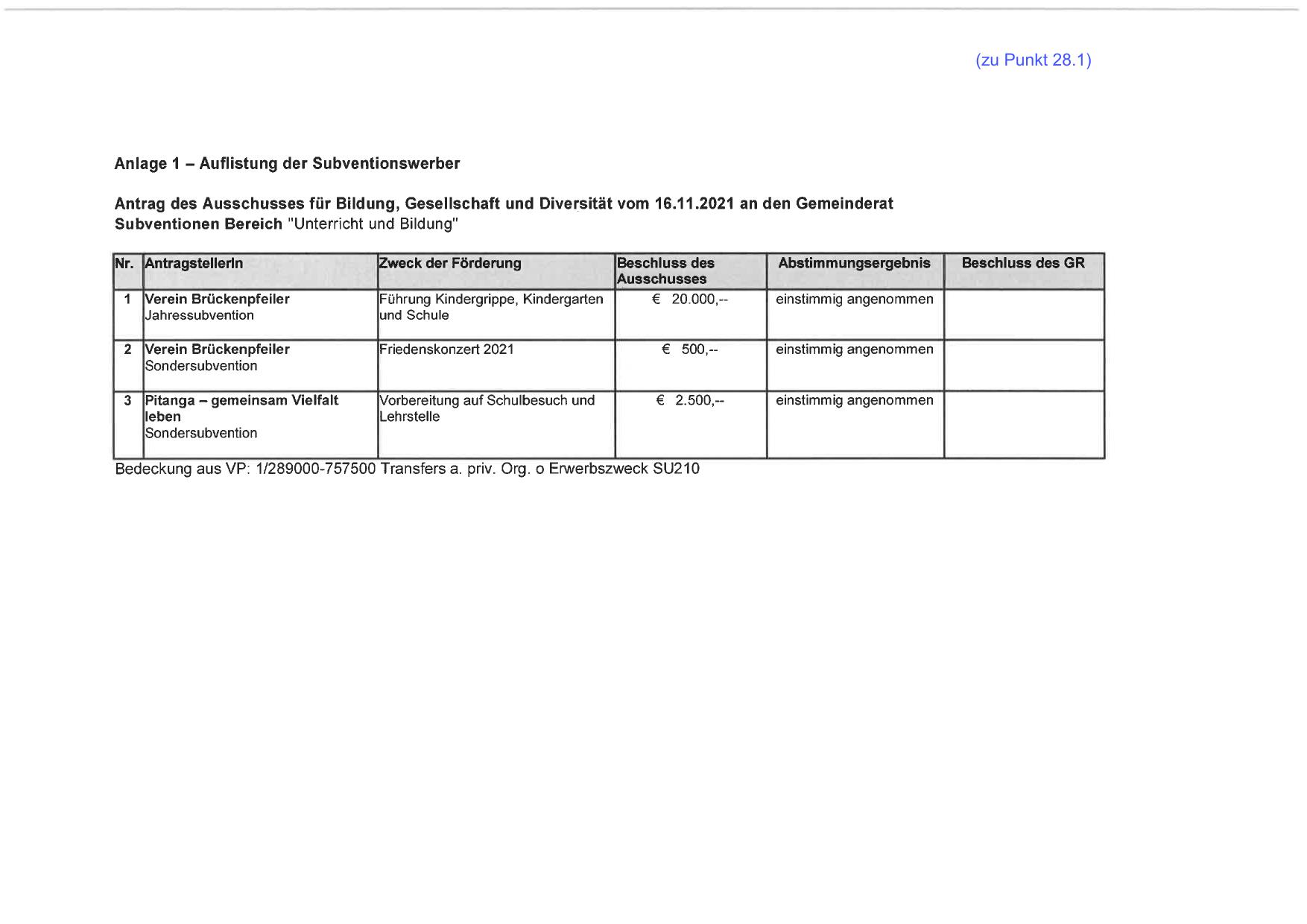 Bedeckung aus VP: 1/289000-757500 Transfers a. priv. Org. o Erwerbszweck SU210