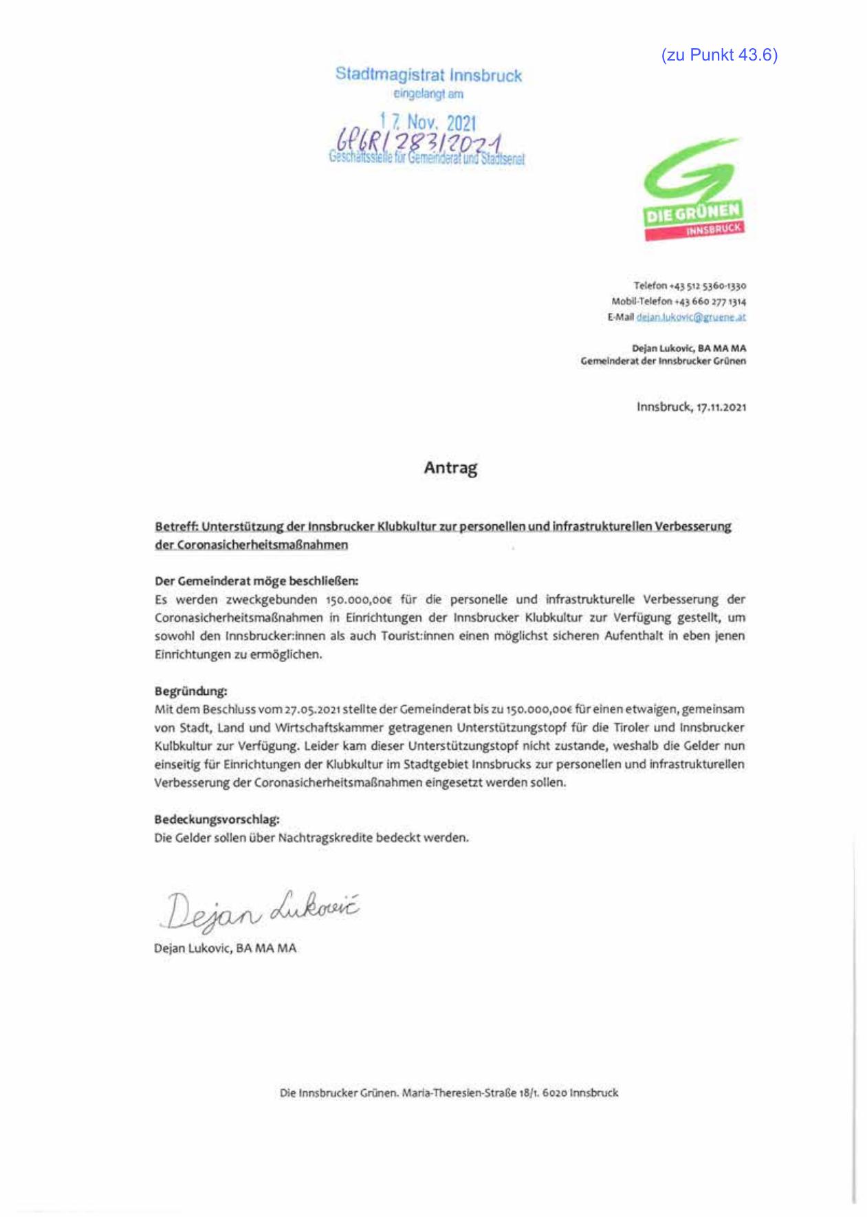 Betreff: Unterstützung der lnnsbrucker Klubkultur zur personellen und infrastrukturellen Verbesserung